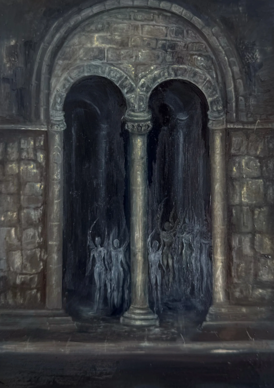 Technically, Unger is a master of her medium. Working entirely from imagination, she builds her scenes through a slow, meticulous process of glazes and scumbles, crafting dense surfaces that seem to breathe. Every vortex of cloud, every flicker of architectural detail, is rendered with both precision and abandon. Through this process, the oil paint becomes alchemical – a living material that shifts between the solid and the spectral.