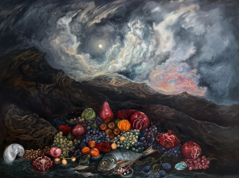 The artist’s references to Baroque chiaroscuro and seventeenth-century Dutch still-lifes are unmistakable. In one striking series, overripe fruit gleams with seductive richness even as it begins to rot, a meditation on consumption and decay that echoes the vanitas tradition. Elsewhere, monumental ruins of classical and brutalist architecture rise from whirling skies, embodiments of power on the verge of collapse.