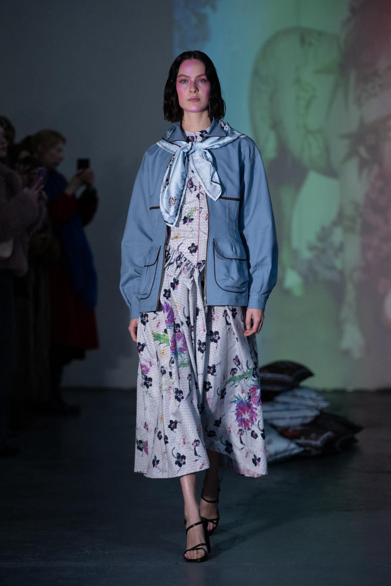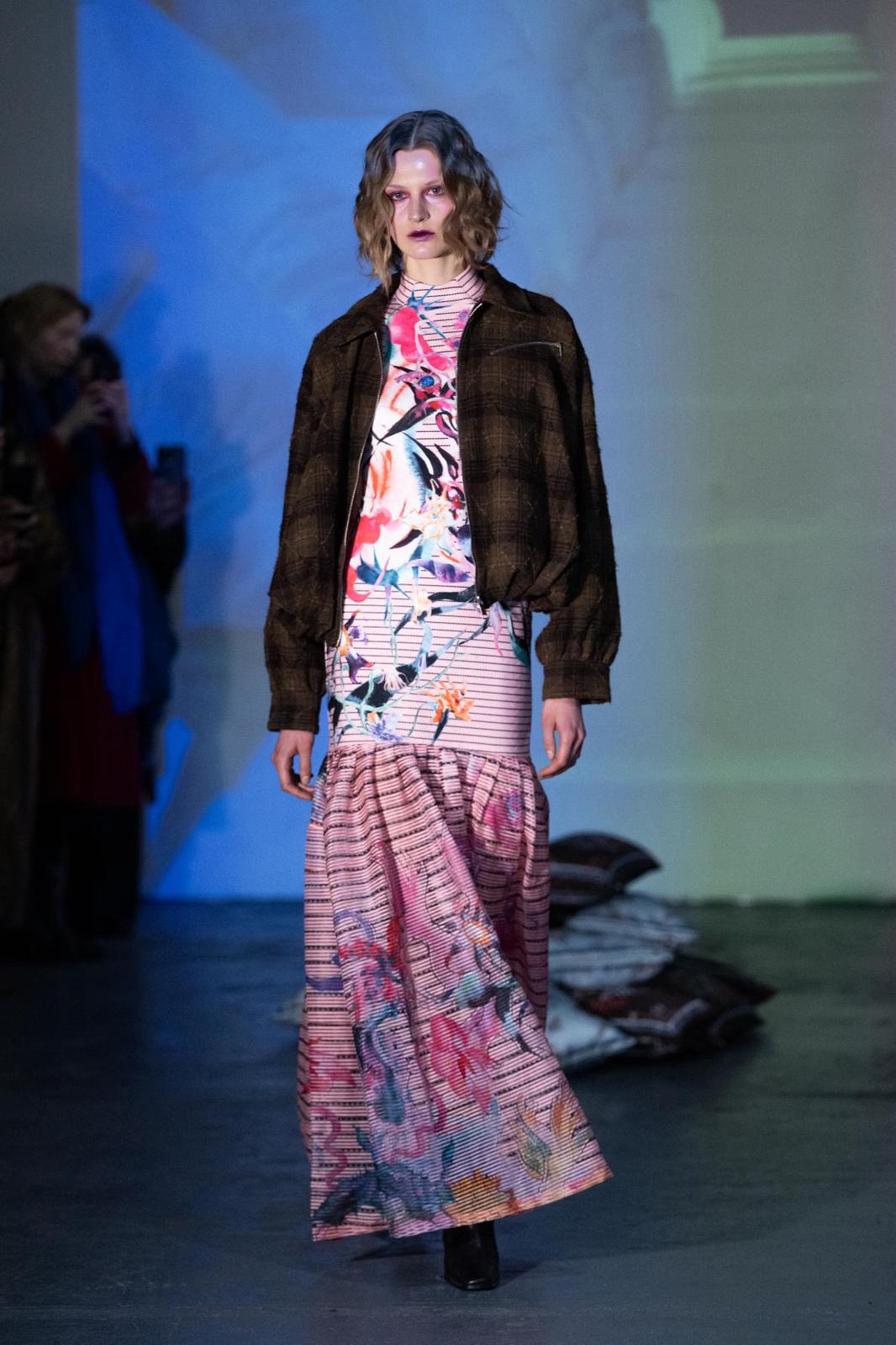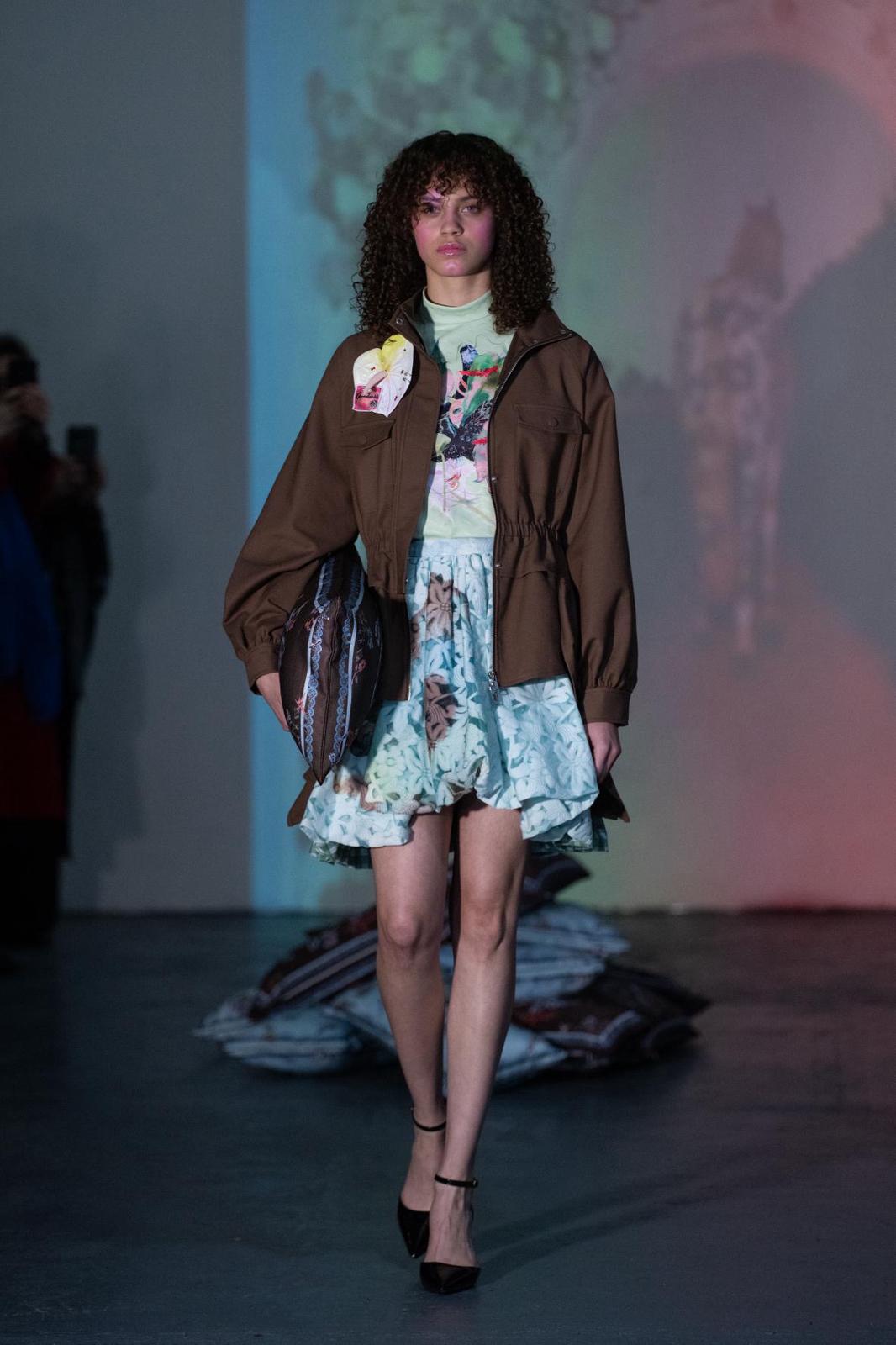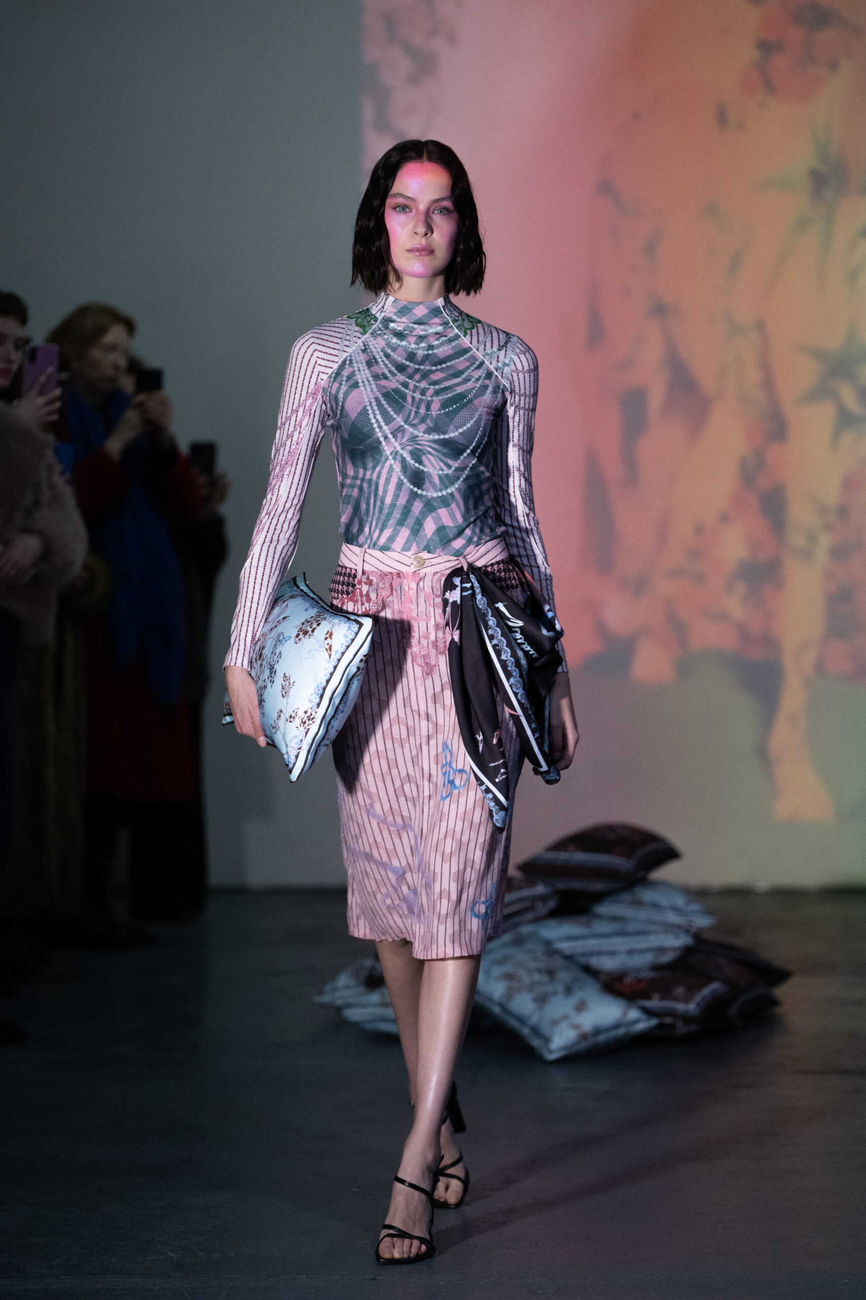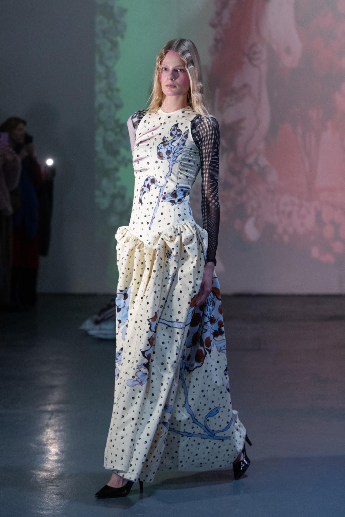 Wang’s latest presentation unfolds like a living fairytale – less a runway than a reverie. Models drift through an ethereal landscape of plush pillowy textures, each swathed in the collection’s custom prints, blurring the boundary between boudoir and dreamscape. It is immersive in the truest sense: a world you don’t simply observe, but sink into.