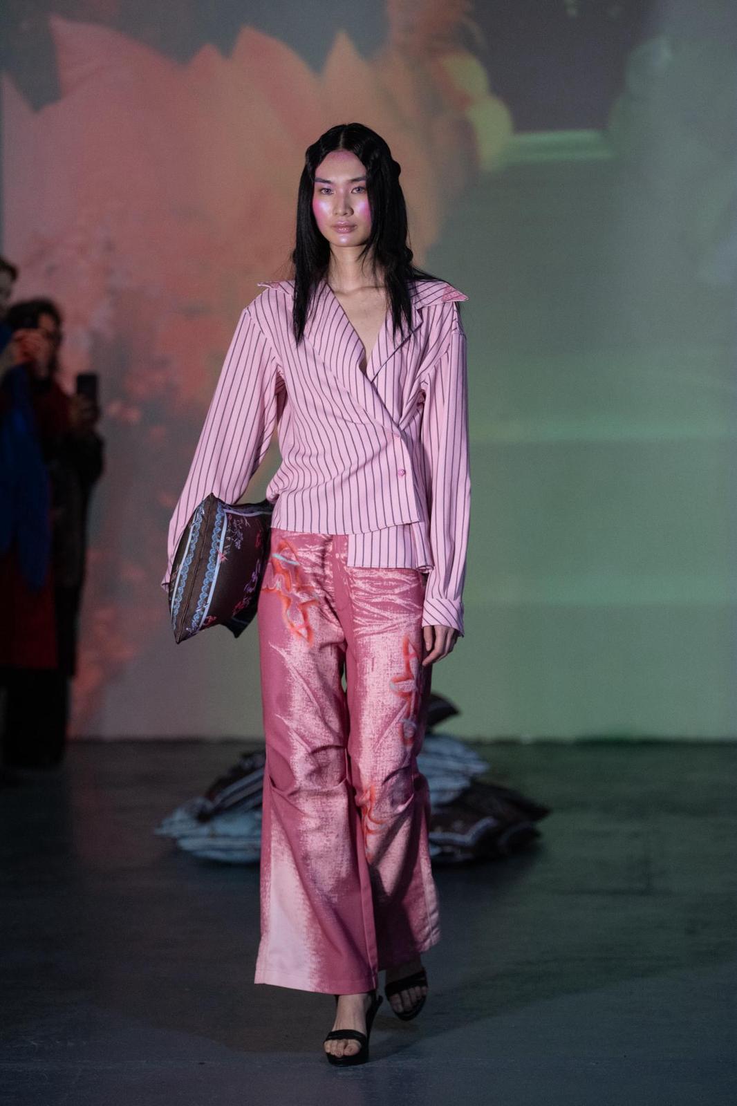 Deeply attuned to online culture and the hyper-visual language of the virtual realm, Wang translates screen-born design codes into something romantic, playful, and exquisitely tactile. Hand-drawn unicorns – delightfully mythical, almost subversive in their sweetness – gallop across silken surfaces, while AI-generated laces and bows introduce a tension between the handcrafted and the computational. It is a dialogue between innocence and algorithm, nostalgia and next-gen artifice.