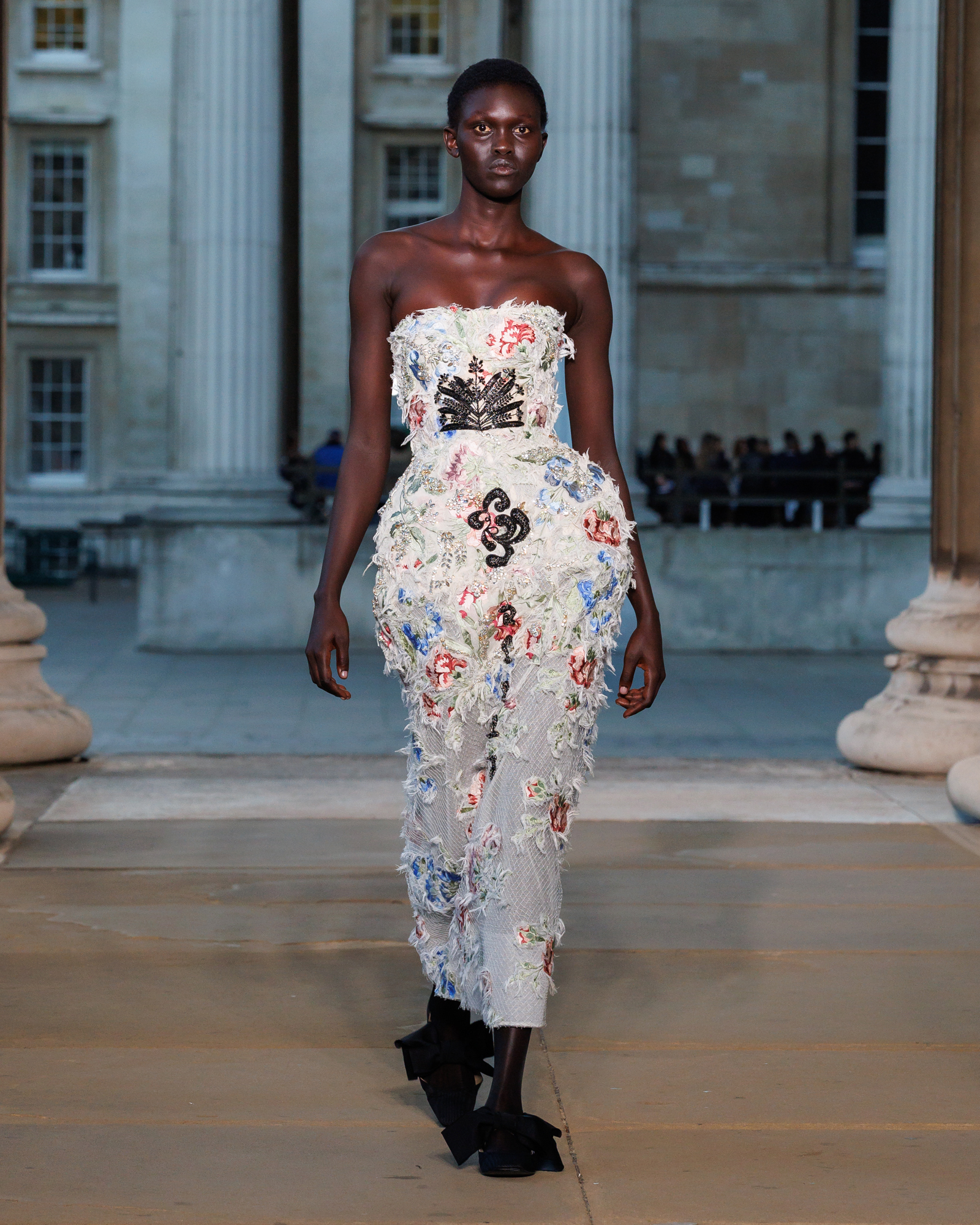 Dresses are spliced with historical threadwork embroidery, two halves literally divided but combined into a whole. Ruffled masculine collars crown flowing floor length gowns. Tailored pinstripe suits are paired with elegantly bowed shoes. Draped column dresses in vivid colours are scattered with florals or metallics, embroidered with patchworks of the past and present.
