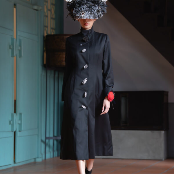 Poet-Lab’s interpretation of tailoring rejected its stiff, restrictive past, replacing it with asymmetry, raw edges, and architectural draping. Oversized batwing coats reimagined traditional outerwear, shifting the silhouette from conventional sharp lines to an elegant, almost organic movement. Trousers abandoned their typical formality, deconstructed into voluminous shapes, while shirting became an expressive canvas of abstract layering and unconventional embellishments.