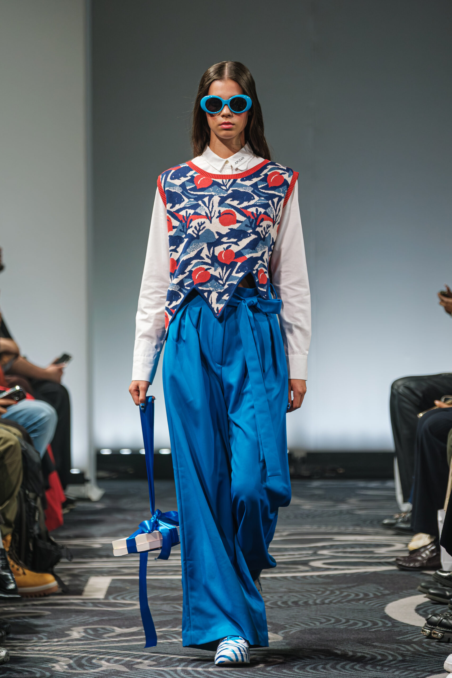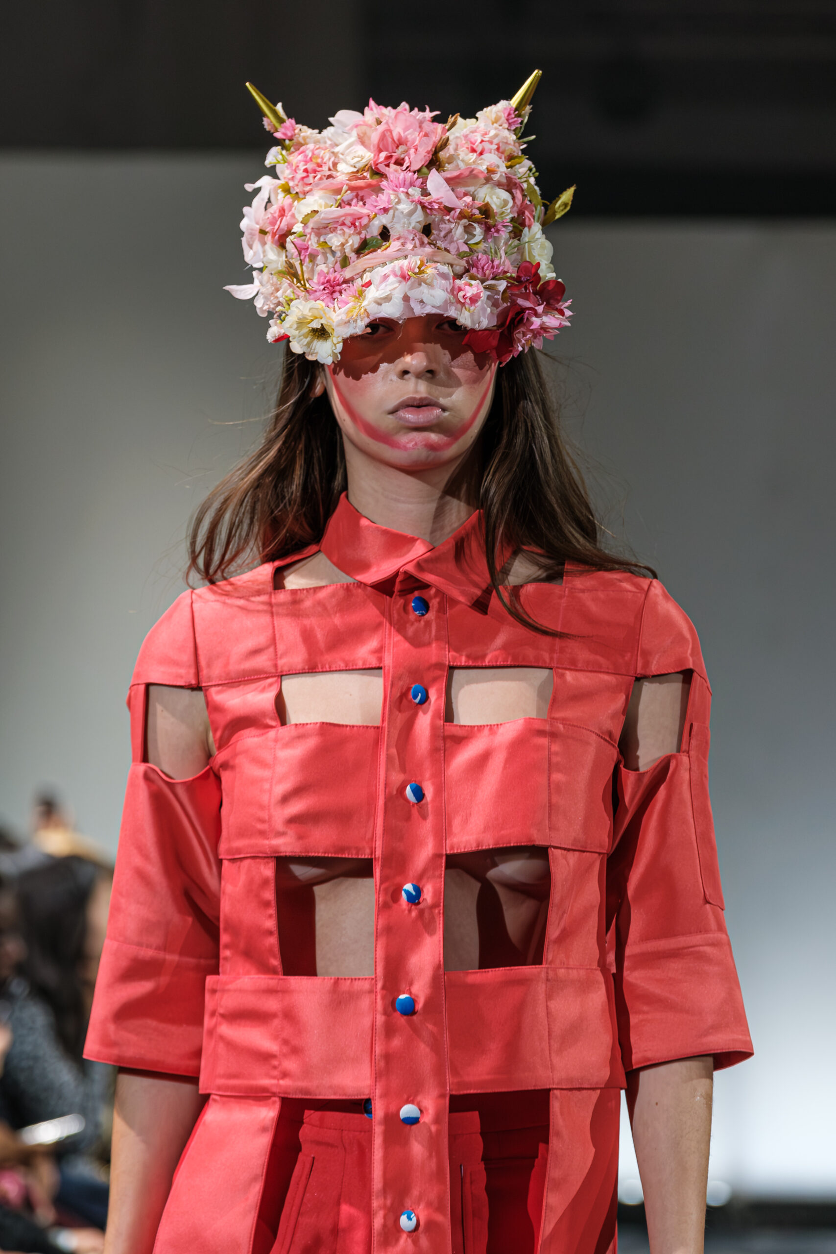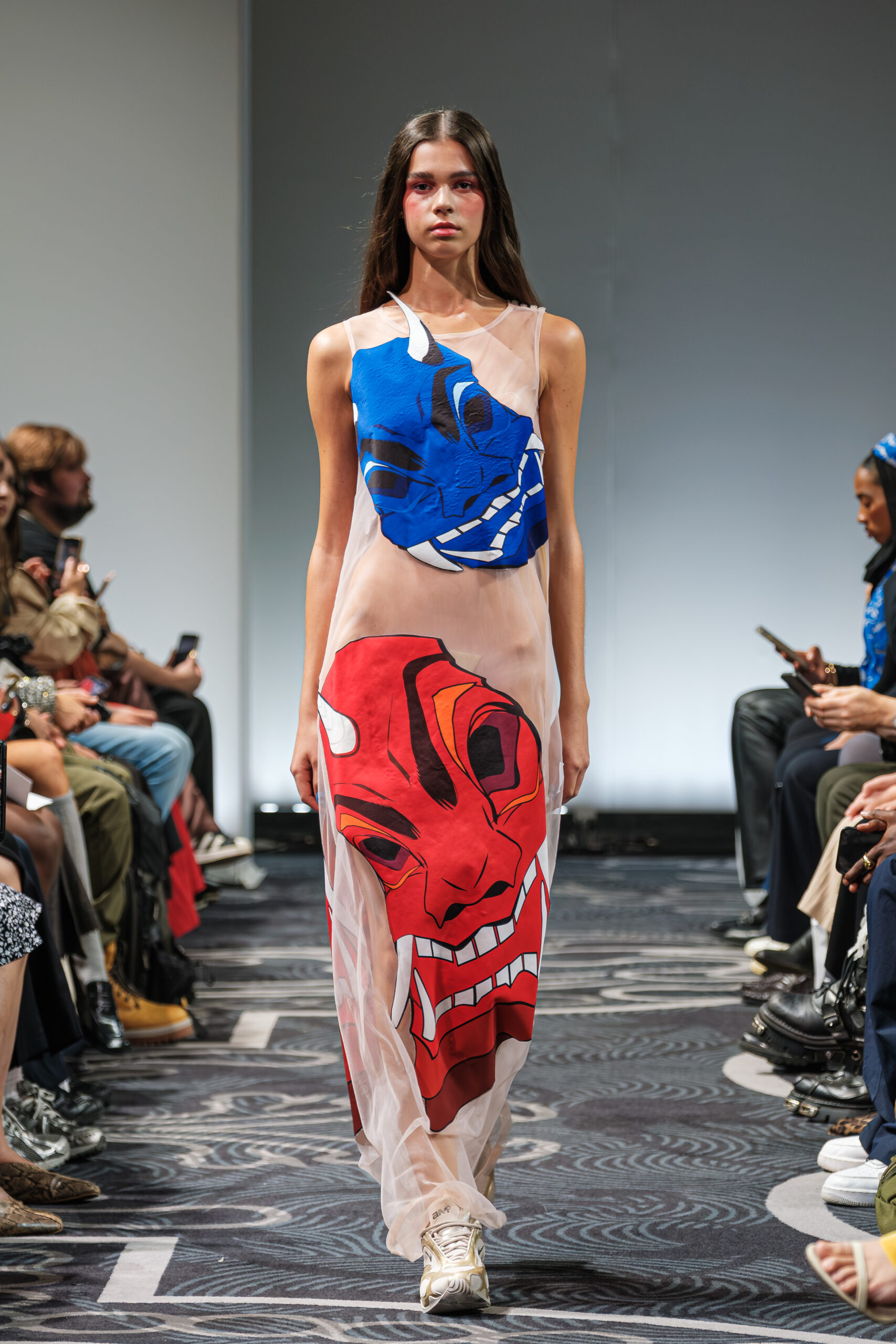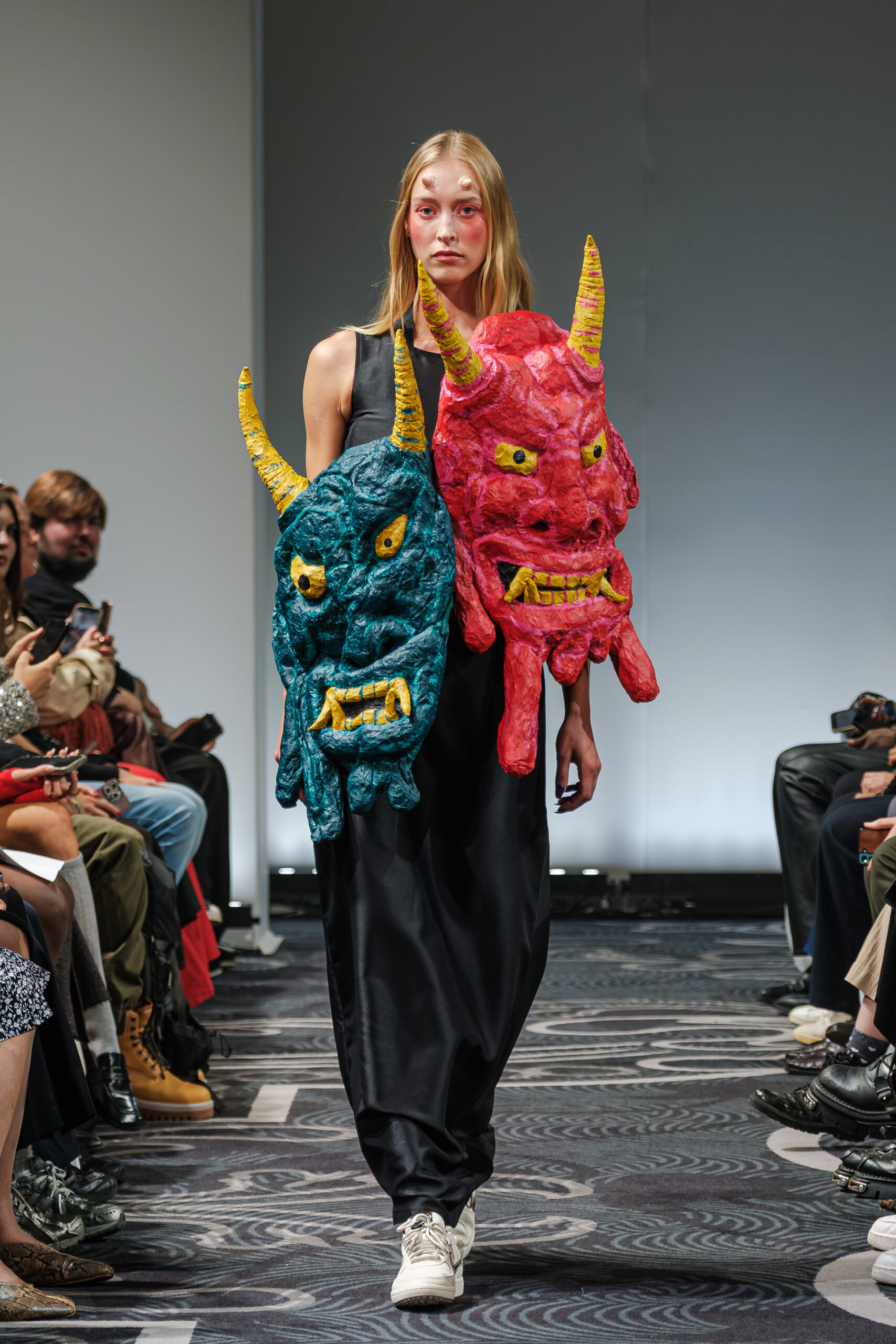 APUJAN’s latest collection captures the fantasy of this voyage, through tailored pieces that capture the floating rhythm of the river, flowing dresses adorned with 3-D casts of mythical creatures and horned headdresses, and a playful dress made of cartoon drawings on scrolls, a visual retelling of Momotaro’s birth. A cinematic, poetic narrative stretched across the catwalk, where fantasy met fabric and imagination became a form of rebellion.