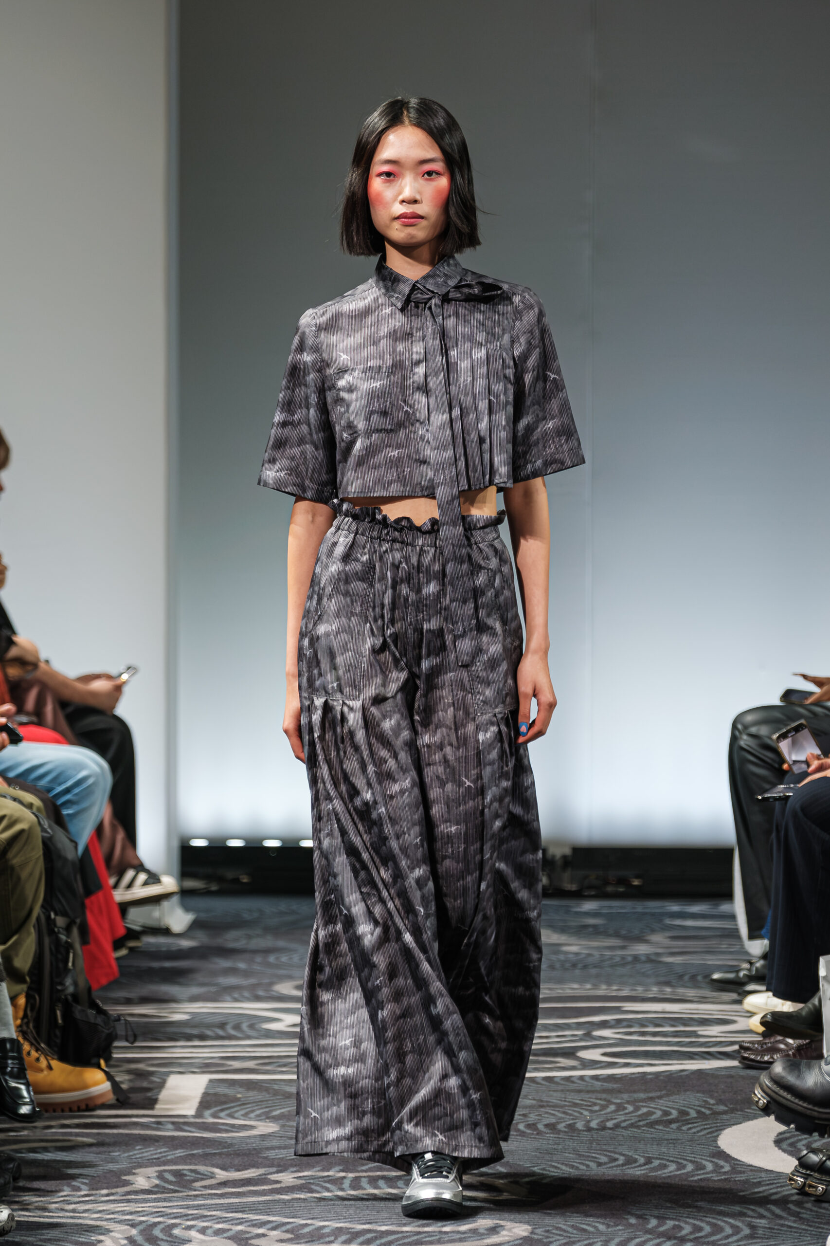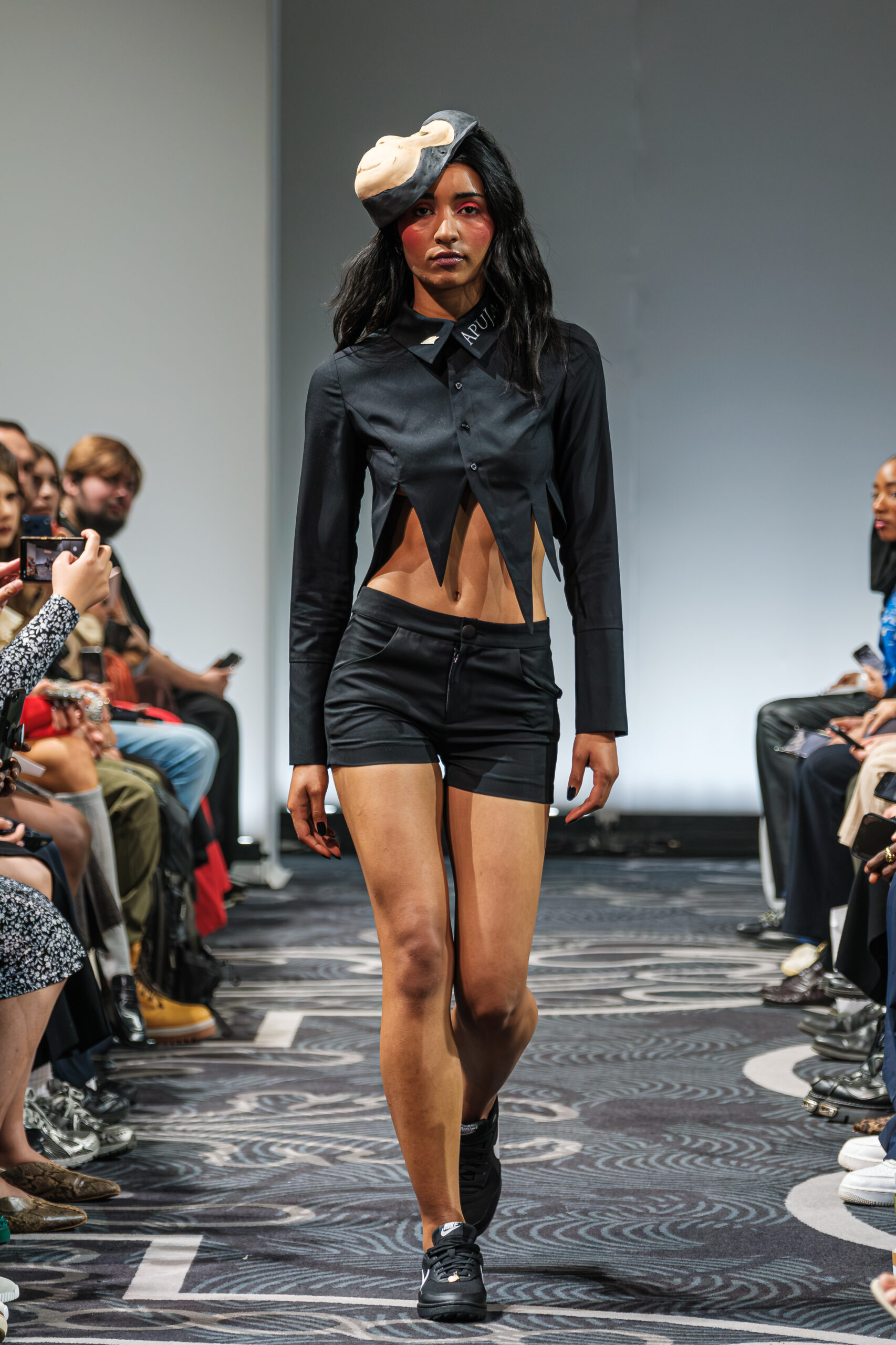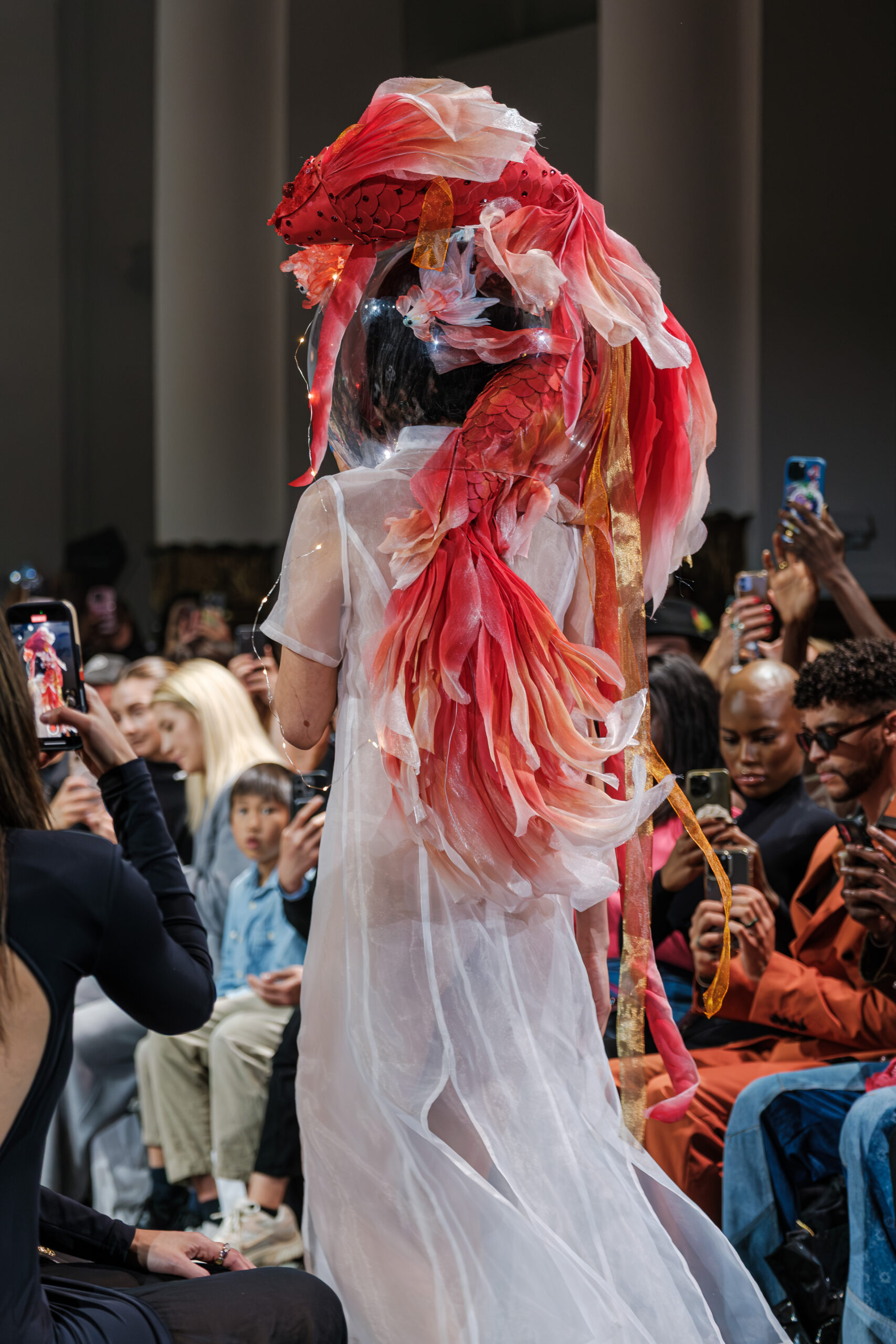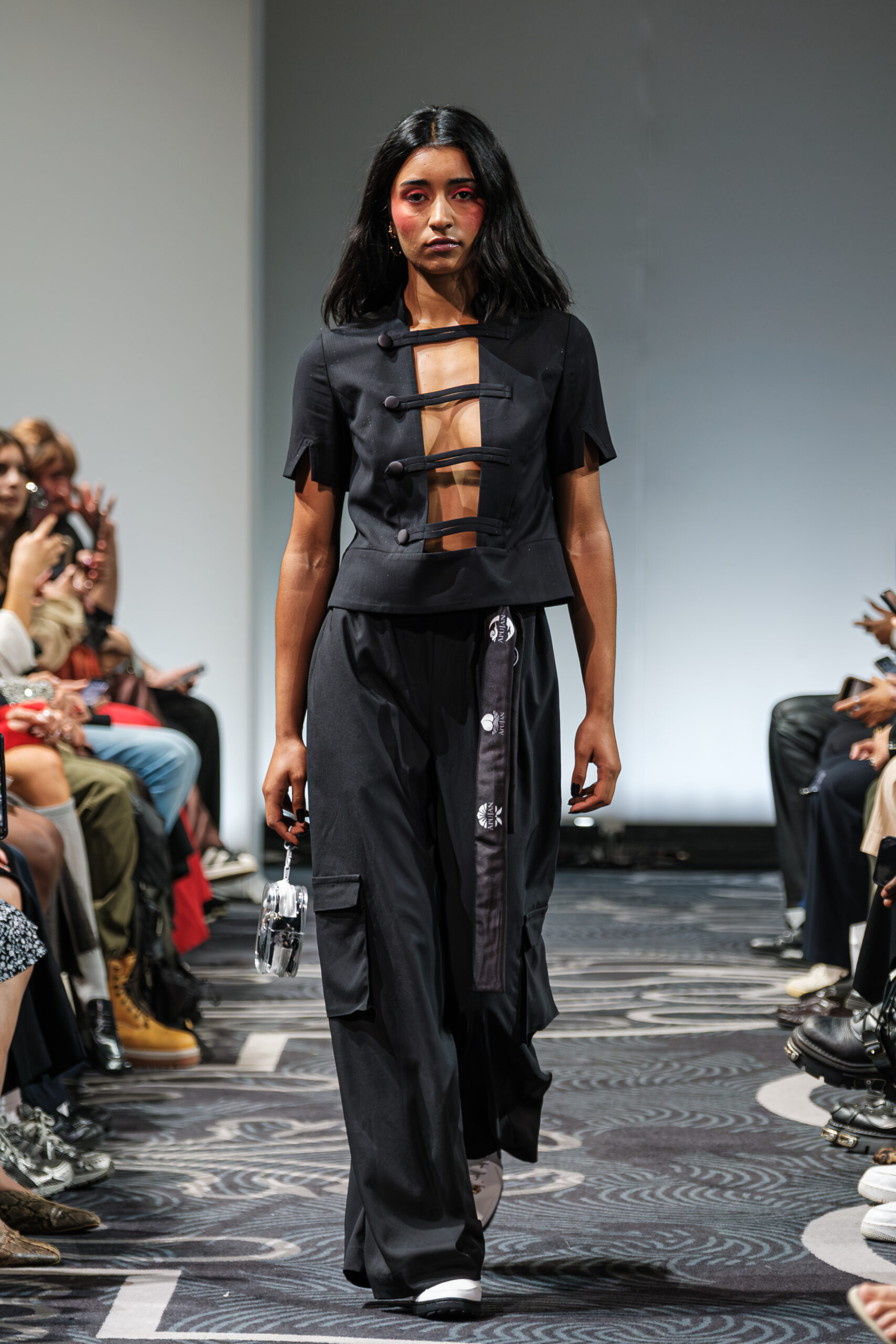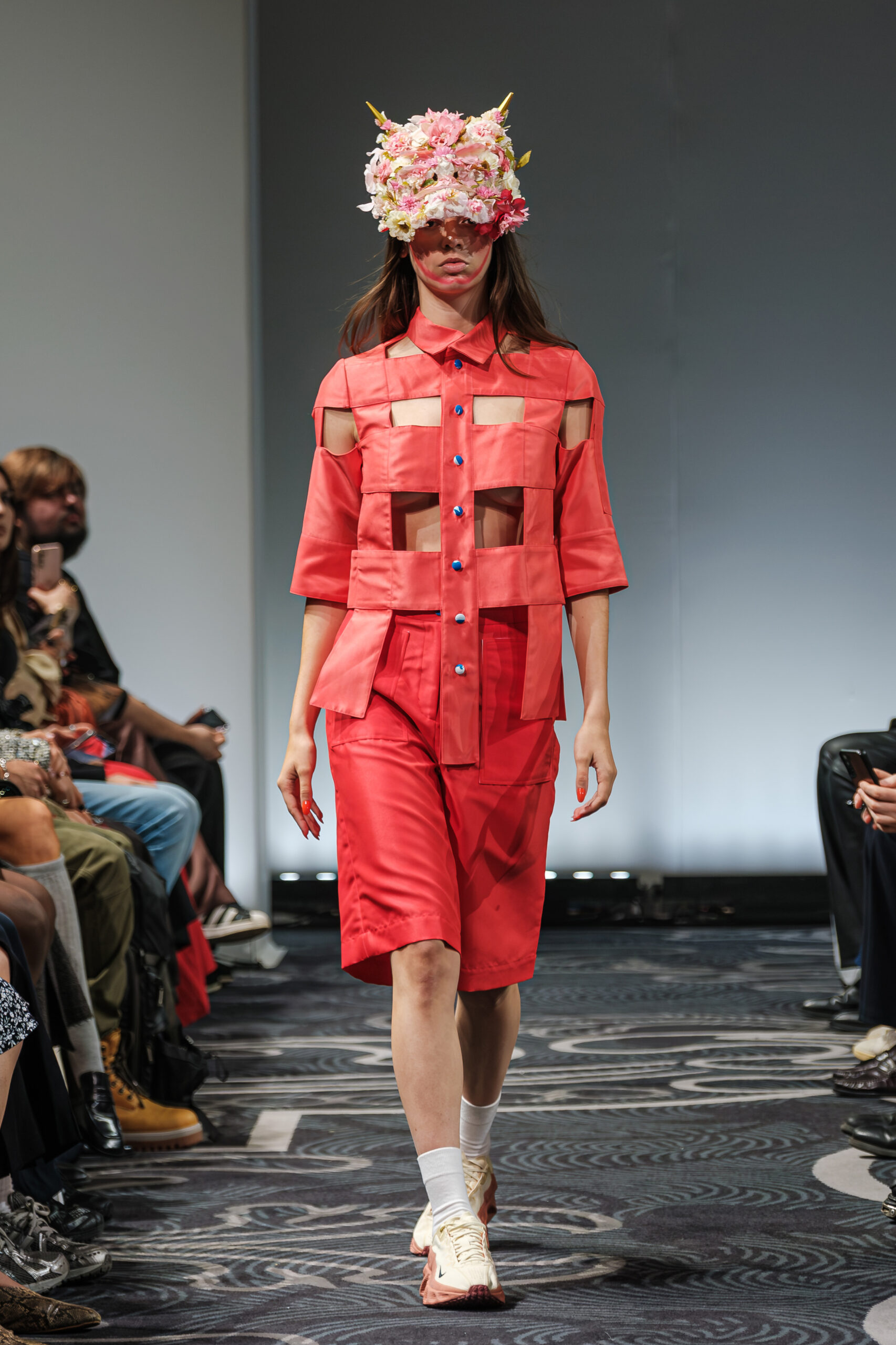 APUJAN’s latest collection captures the fantasy of this voyage, through tailored pieces that capture the floating rhythm of the river, flowing dresses adorned with 3-D casts of mythical creatures and horned headdresses, and a playful dress made of cartoon drawings on scrolls, a visual retelling of Momotaro’s birth. A cinematic, poetic narrative stretched across the catwalk, where fantasy met fabric and imagination became a form of rebellion.