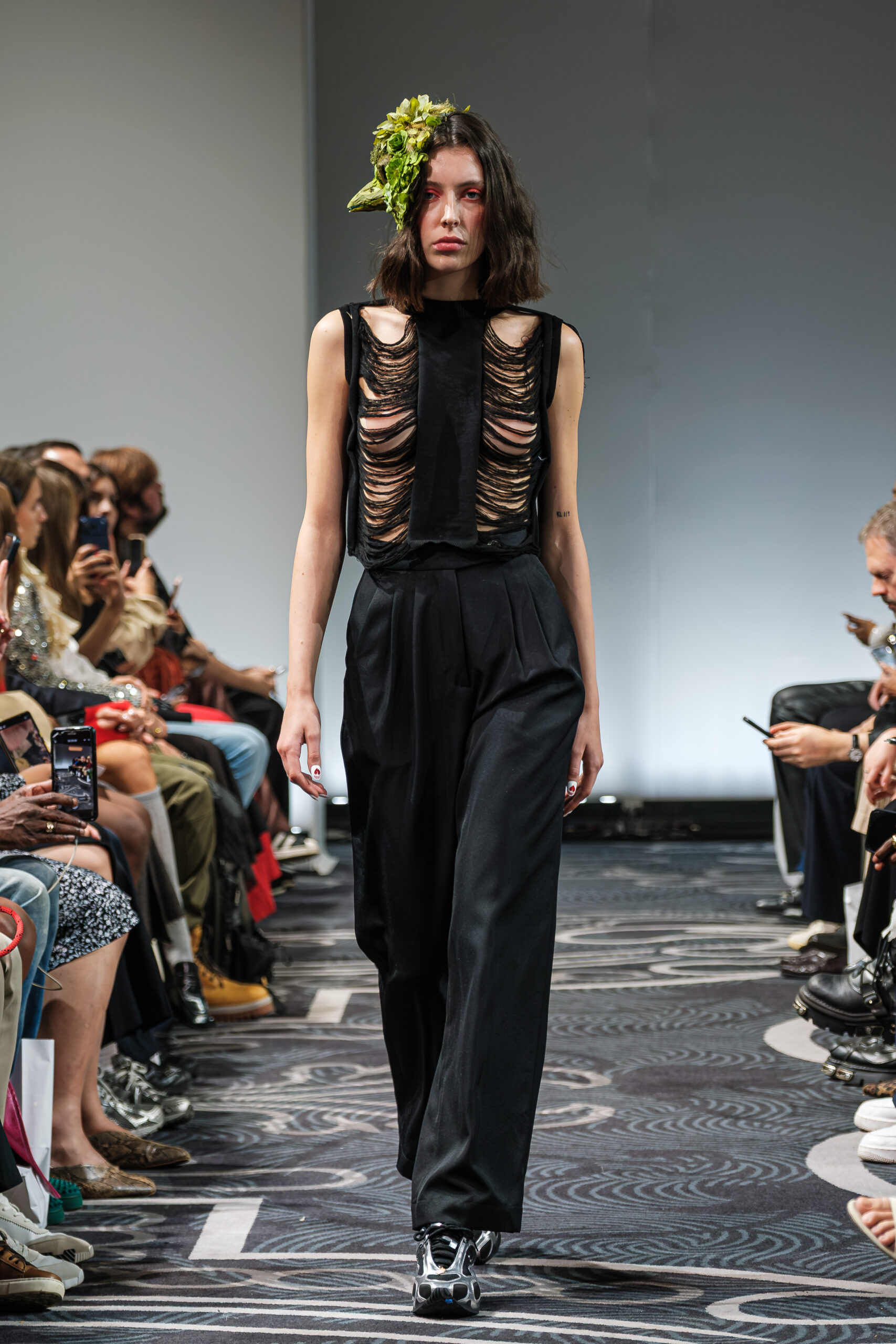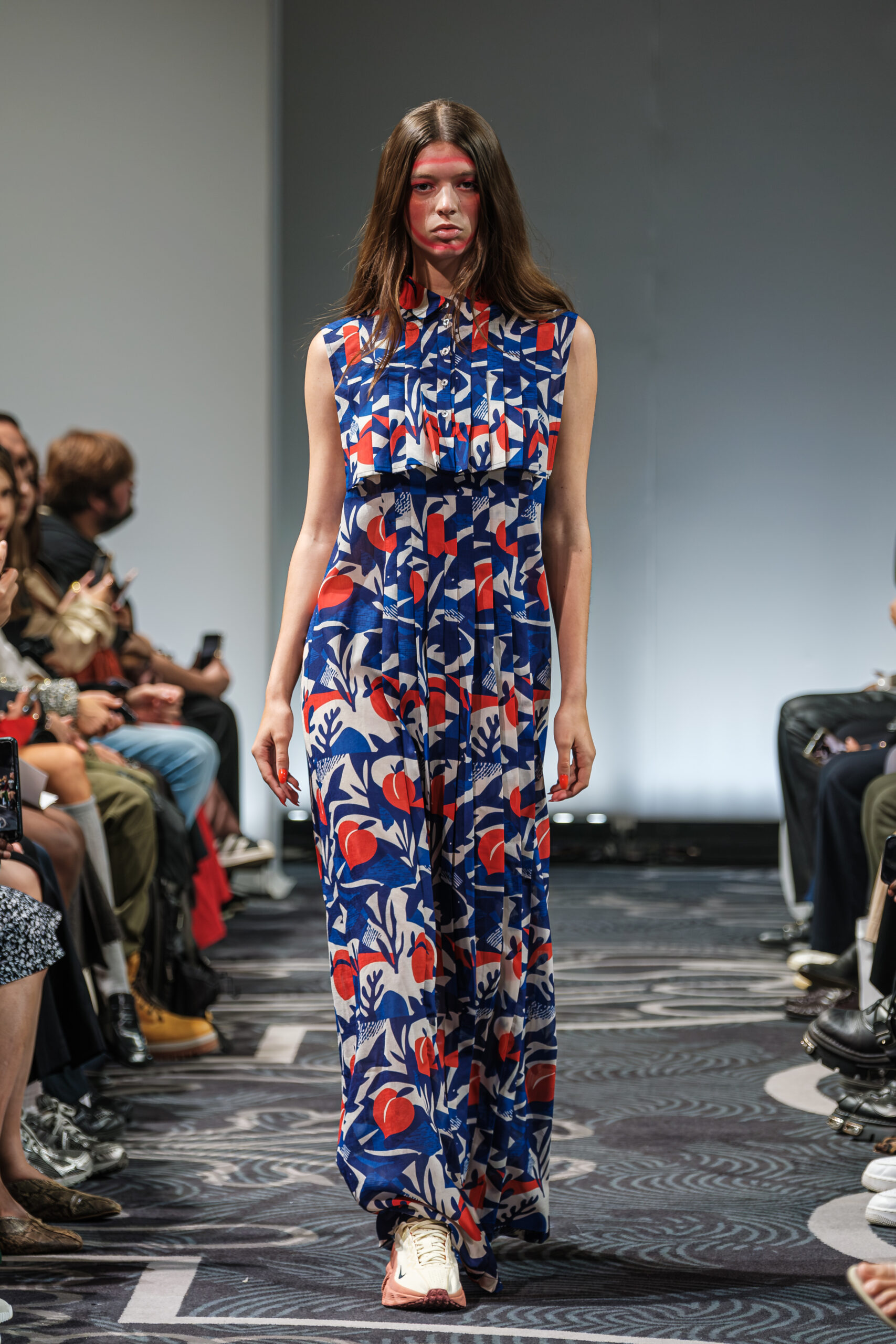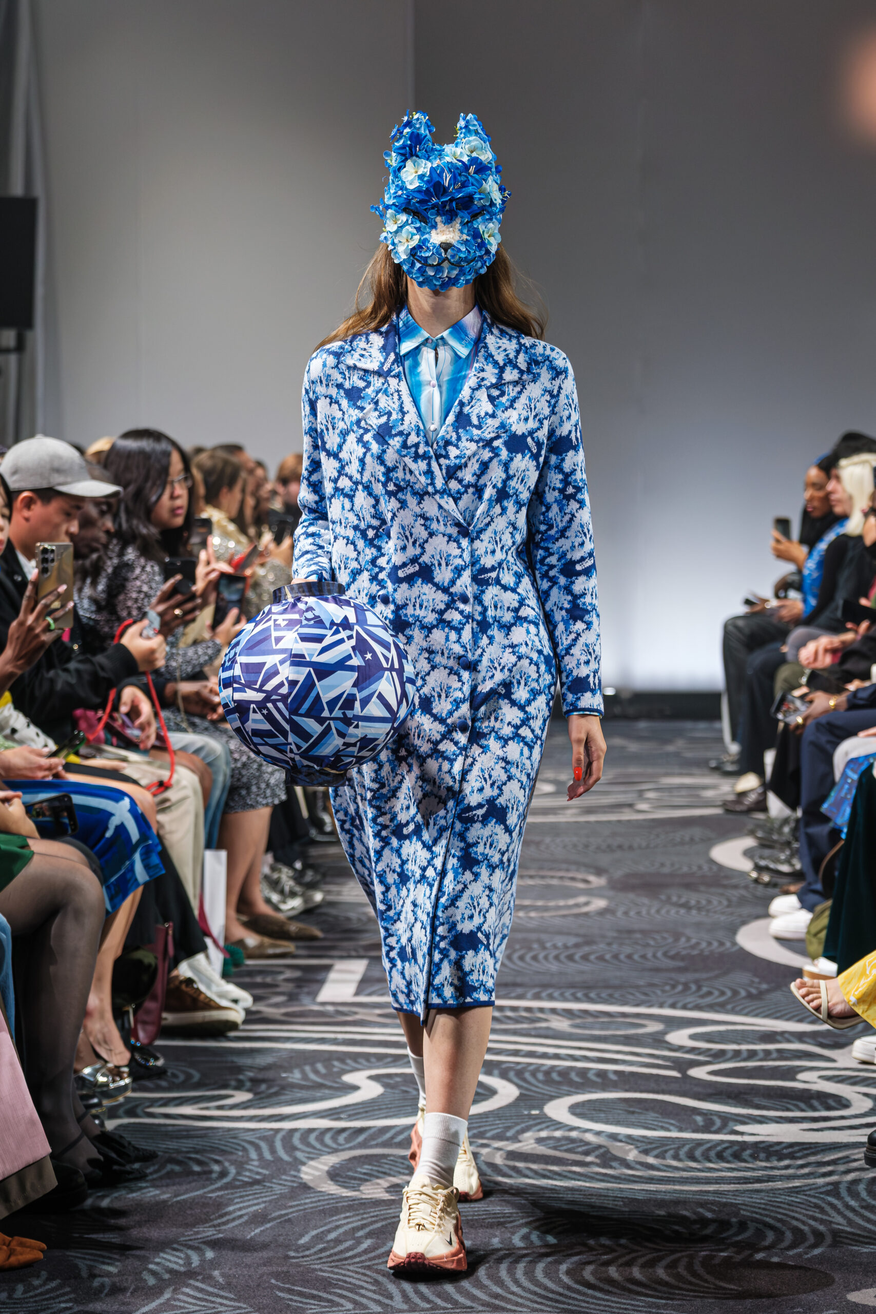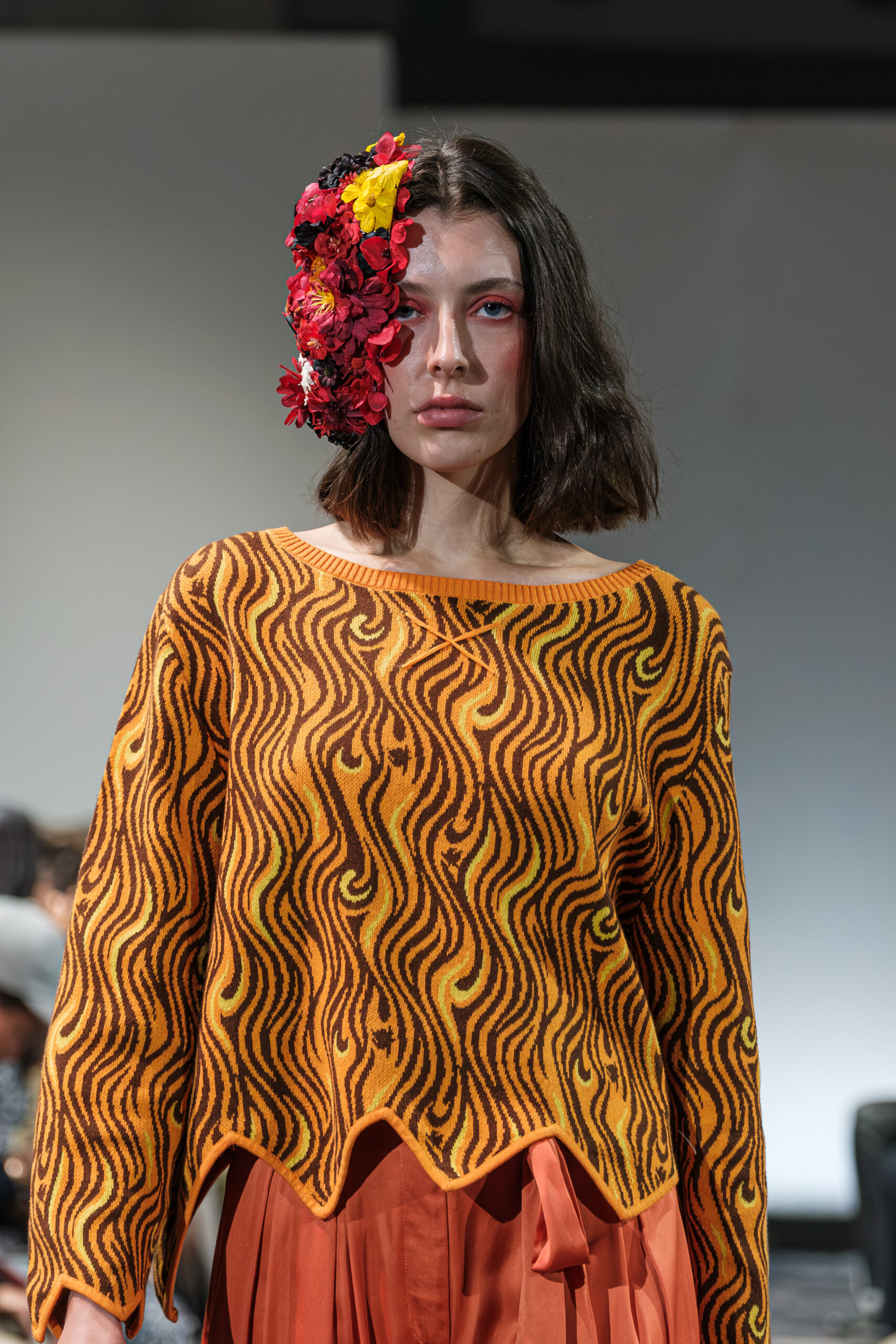 APUJAN’s latest collection captures the fantasy of this voyage, through tailored pieces that capture the floating rhythm of the river, flowing dresses adorned with 3-D casts of mythical creatures and horned headdresses, and a playful dress made of cartoon drawings on scrolls, a visual retelling of Momotaro’s birth. A cinematic, poetic narrative stretched across the catwalk, where fantasy met fabric and imagination became a form of rebellion.