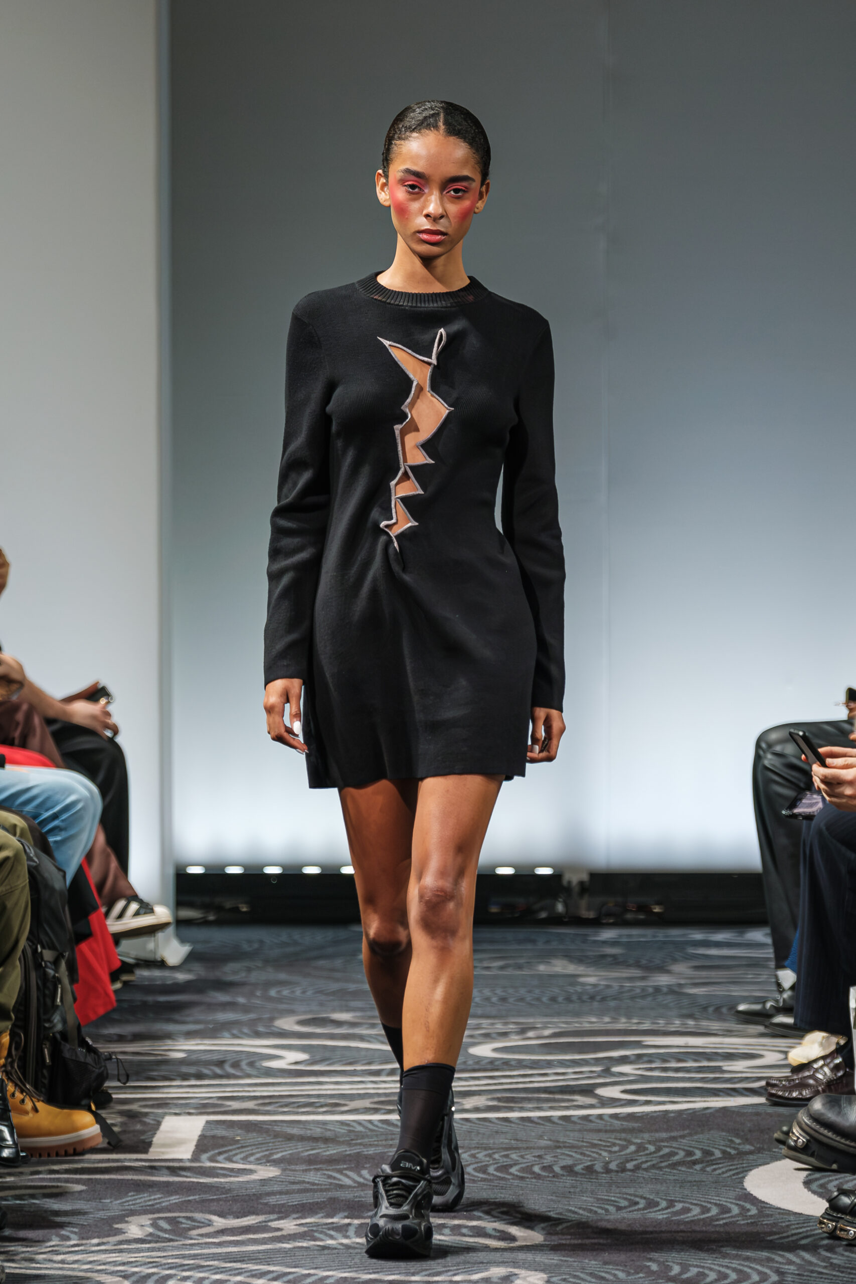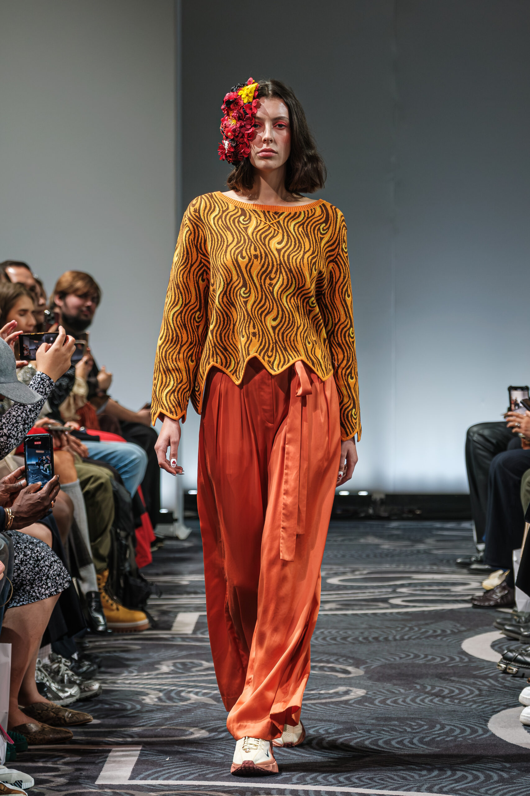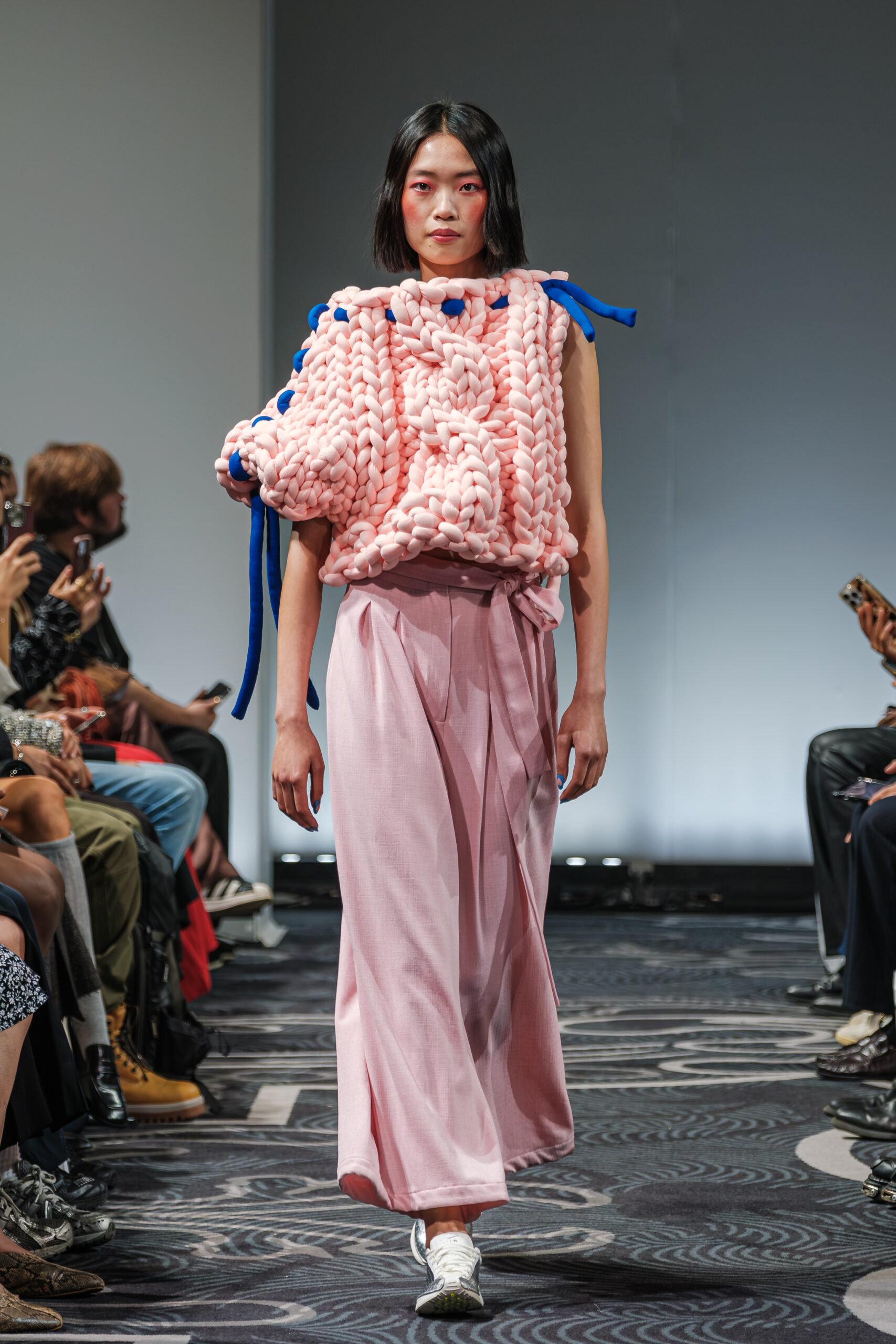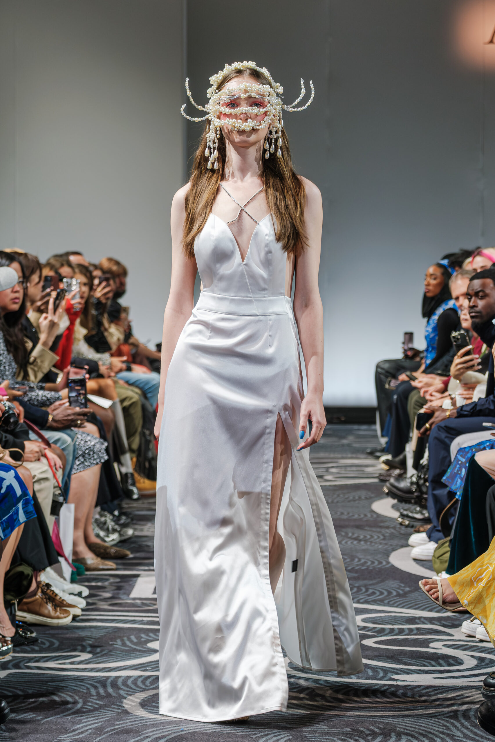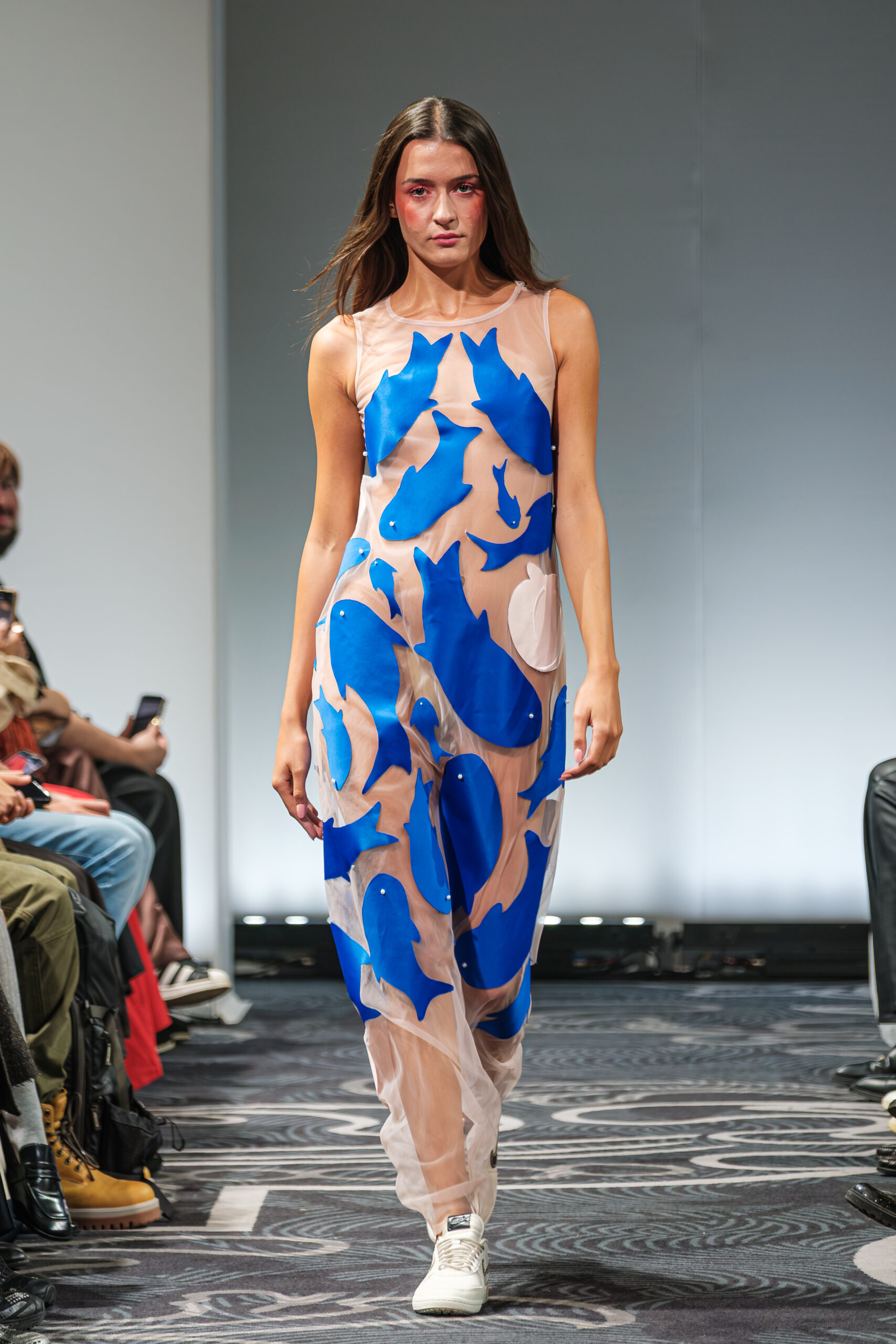 APUJAN’s latest collection captures the fantasy of this voyage, through tailored pieces that capture the floating rhythm of the river, flowing dresses adorned with 3-D casts of mythical creatures and horned headdresses, and a playful dress made of cartoon drawings on scrolls, a visual retelling of Momotaro’s birth. A cinematic, poetic narrative stretched across the catwalk, where fantasy met fabric and imagination became a form of rebellion.