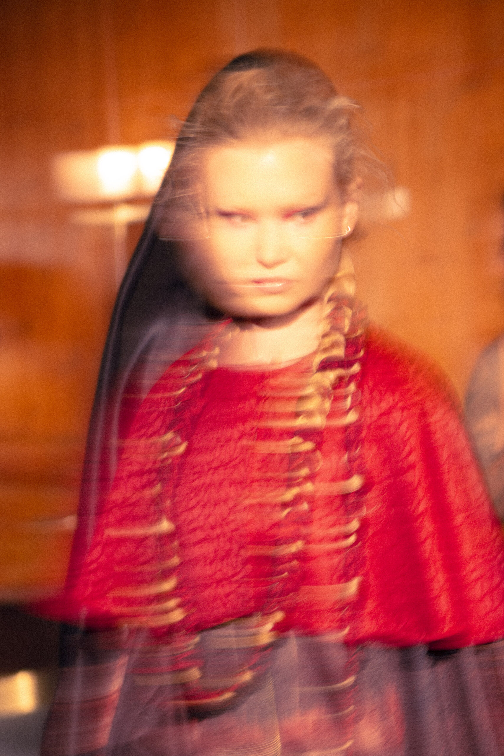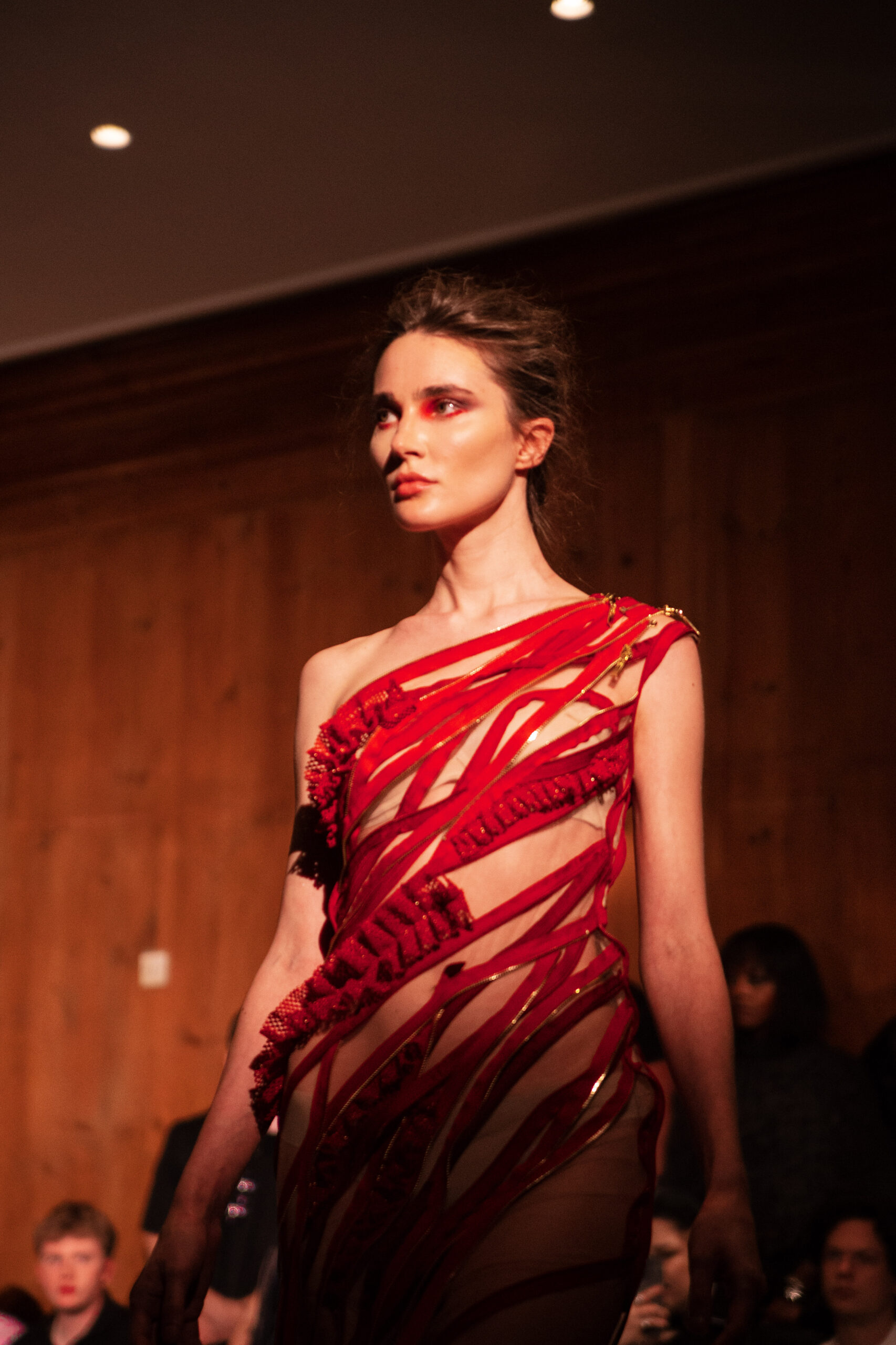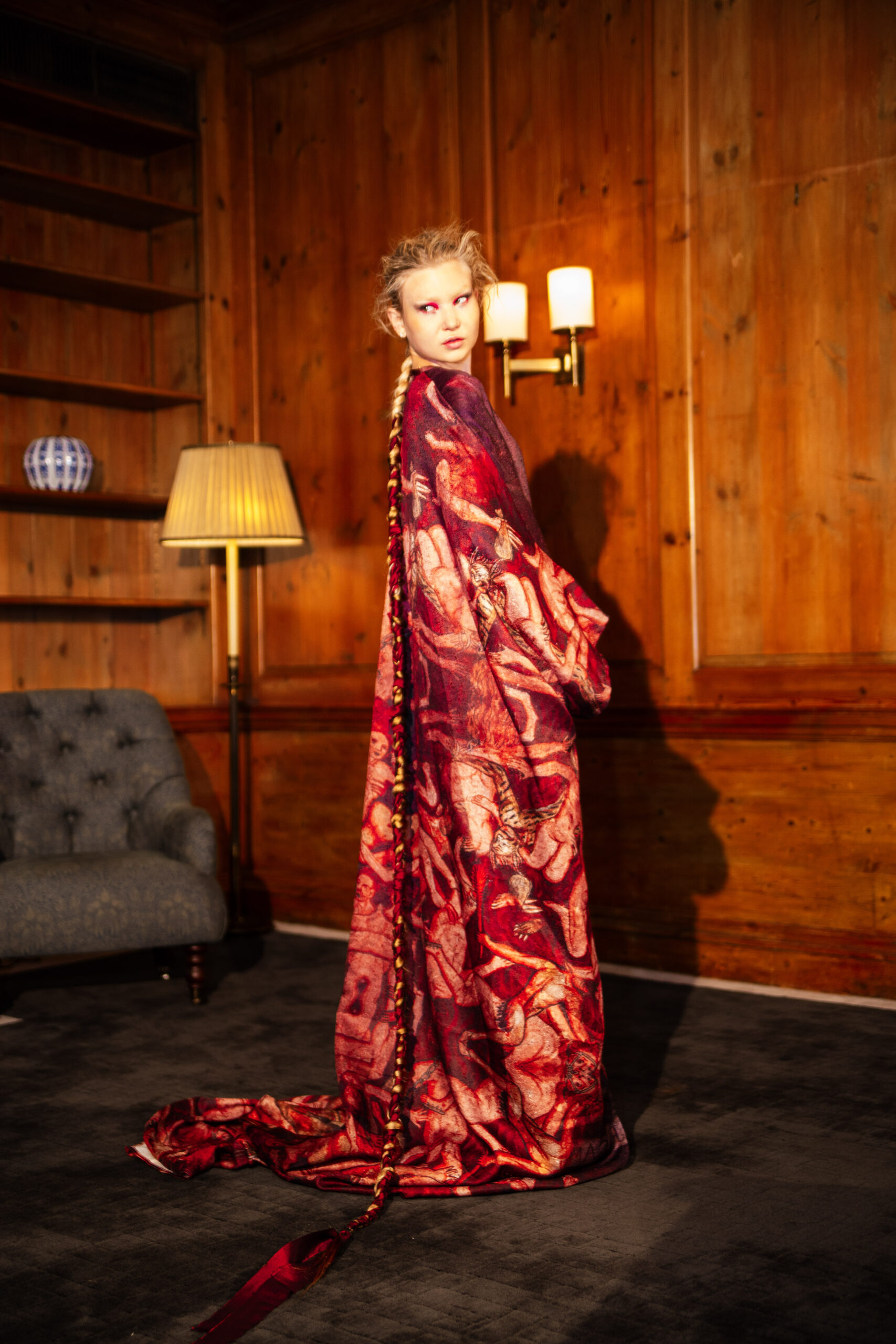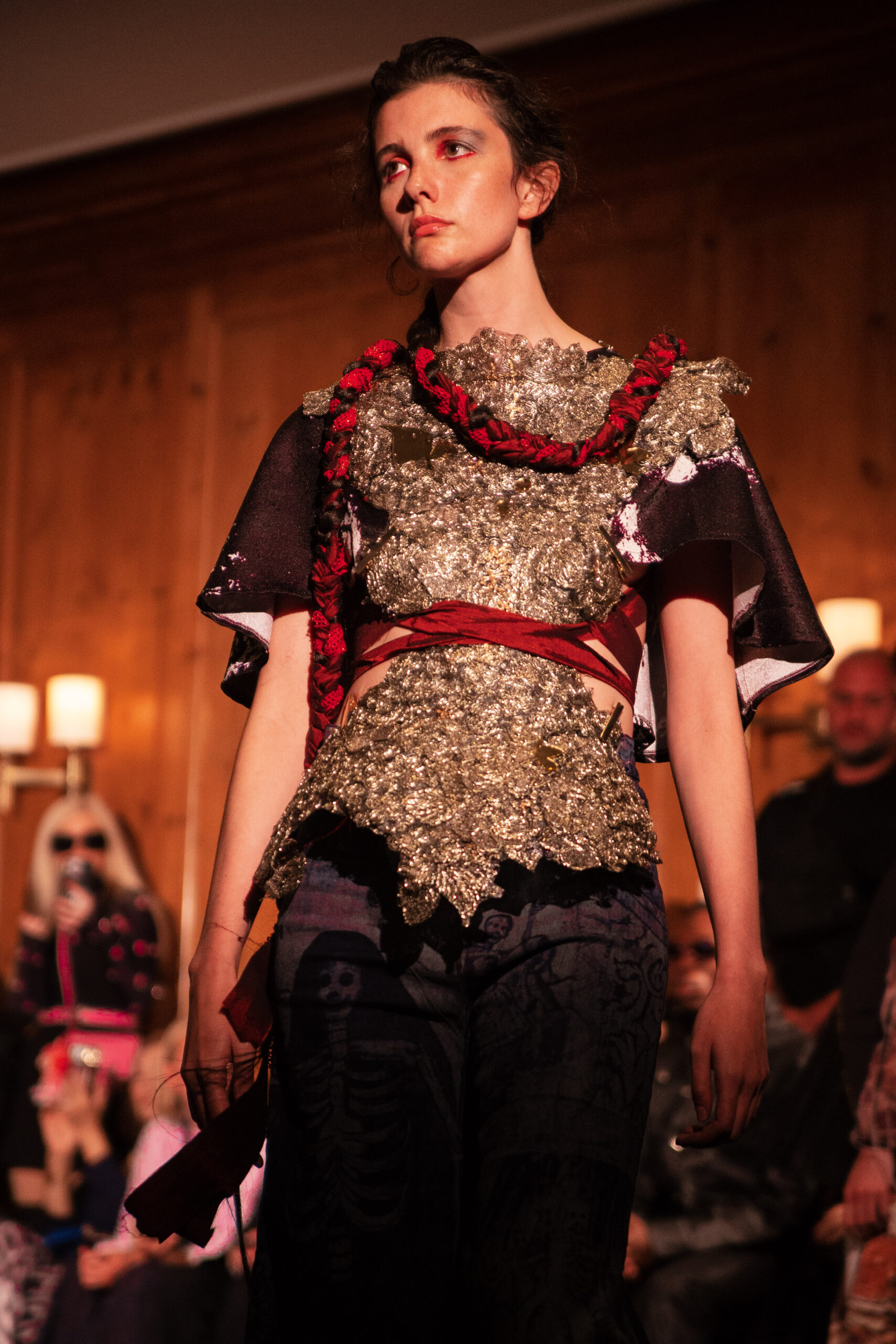 Red flowing robes embroidered with sacred figures, shawls etched with Latin scripture, and breastplates sculpted into gilded wings set the tone for the collection. Cut-out dresses appear frayed yet resolute, their fragile seams holding together in deliberate tension, a harmony born from rupture. Each garment becomes a relic of devotion and defiance – garments as modern altarpieces, balancing reverence with rebellion.