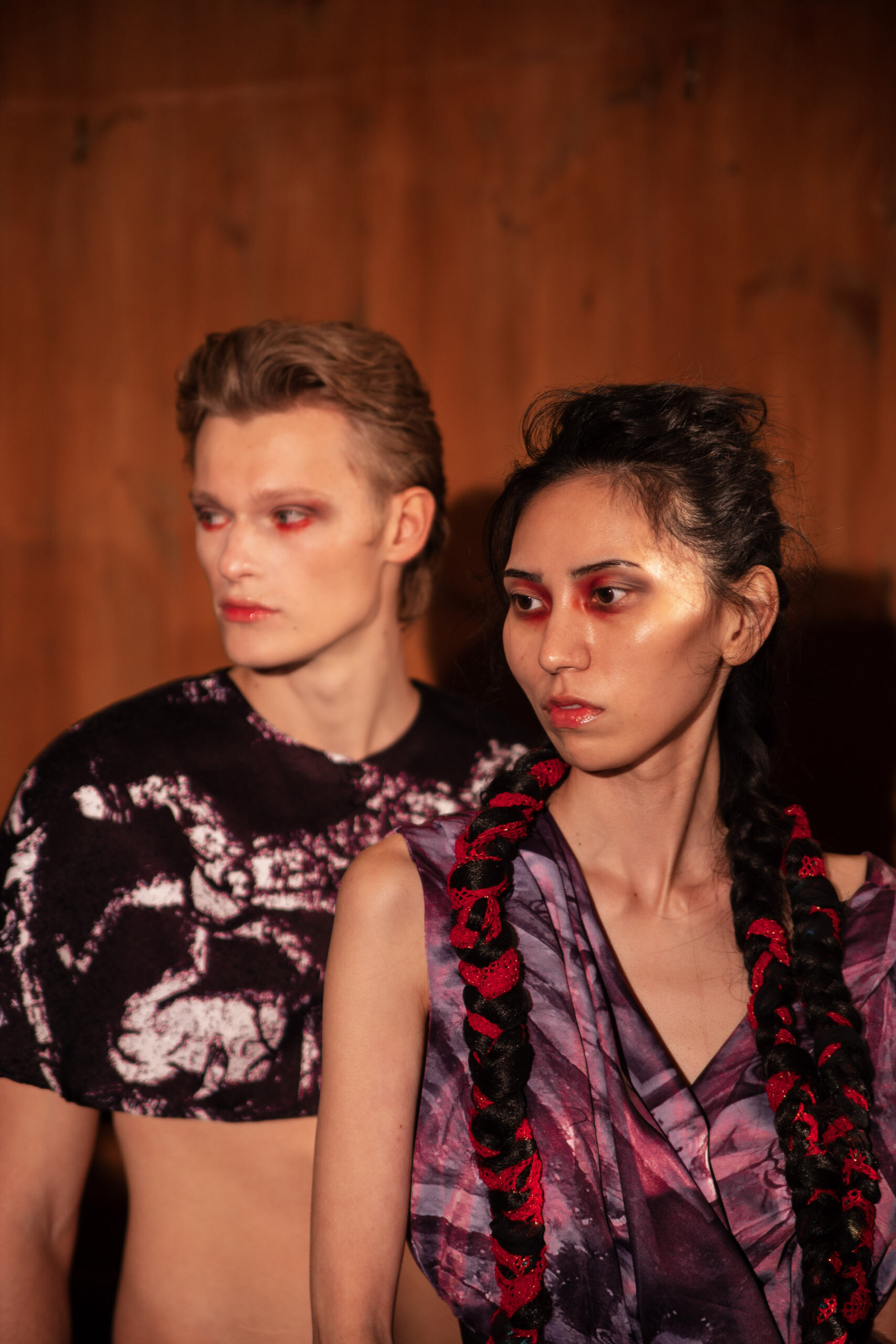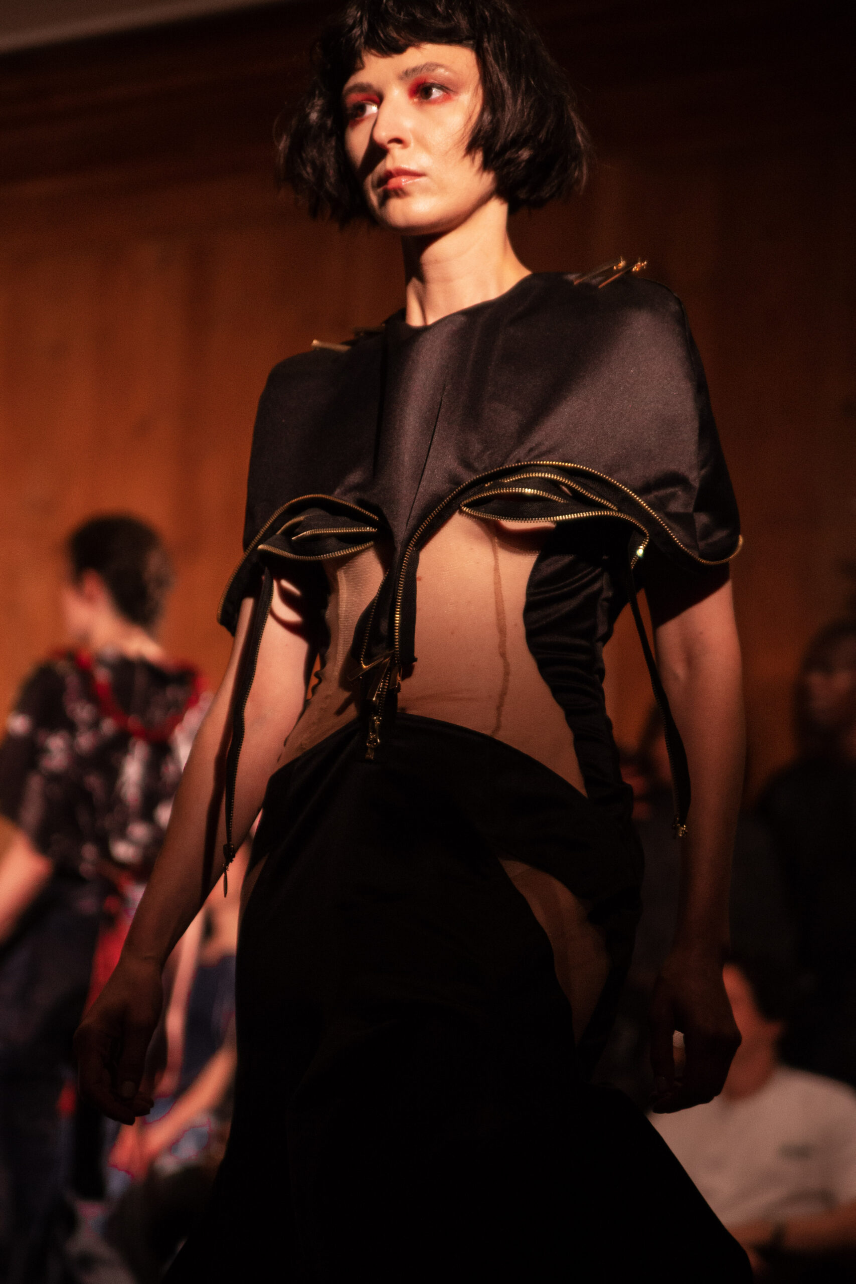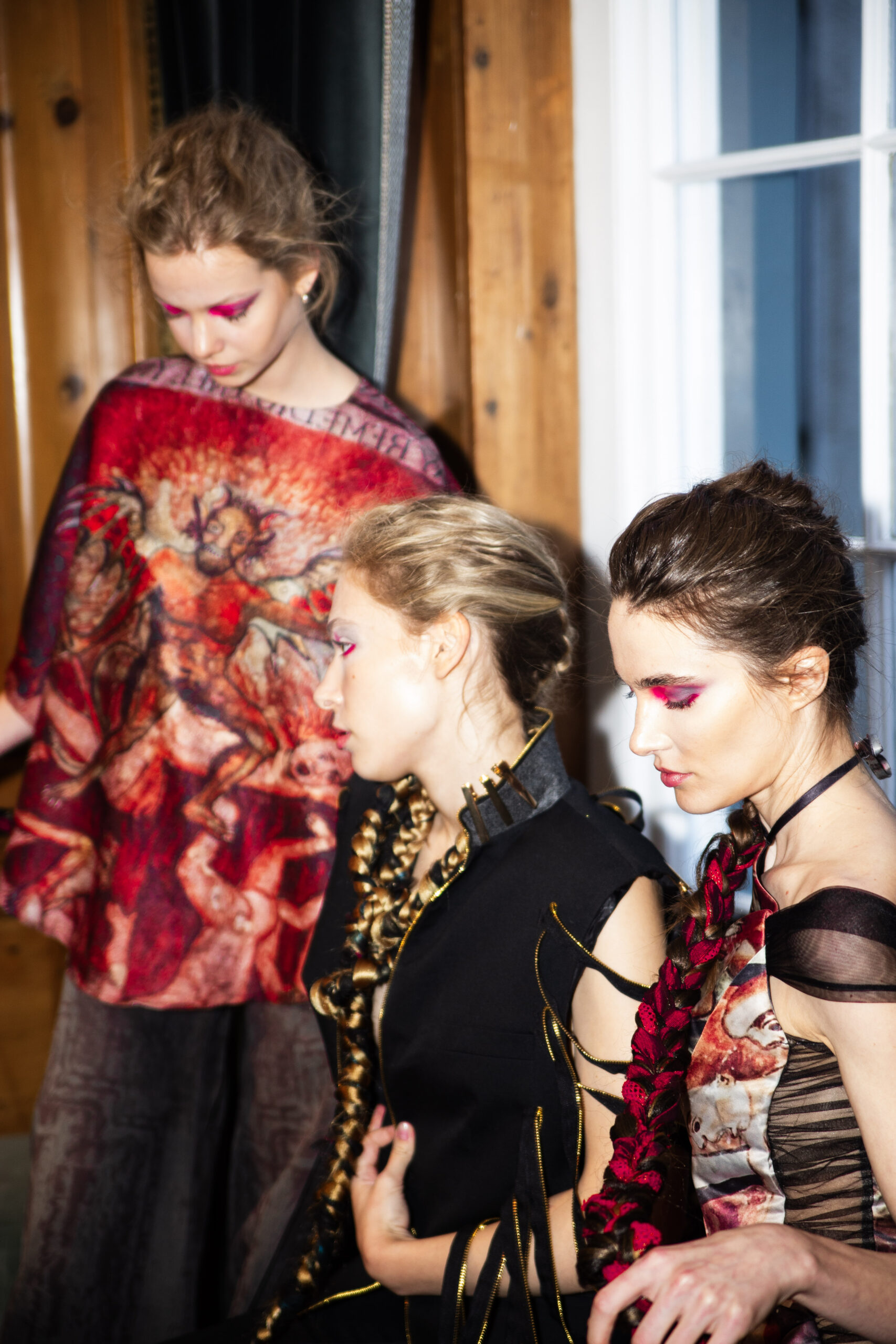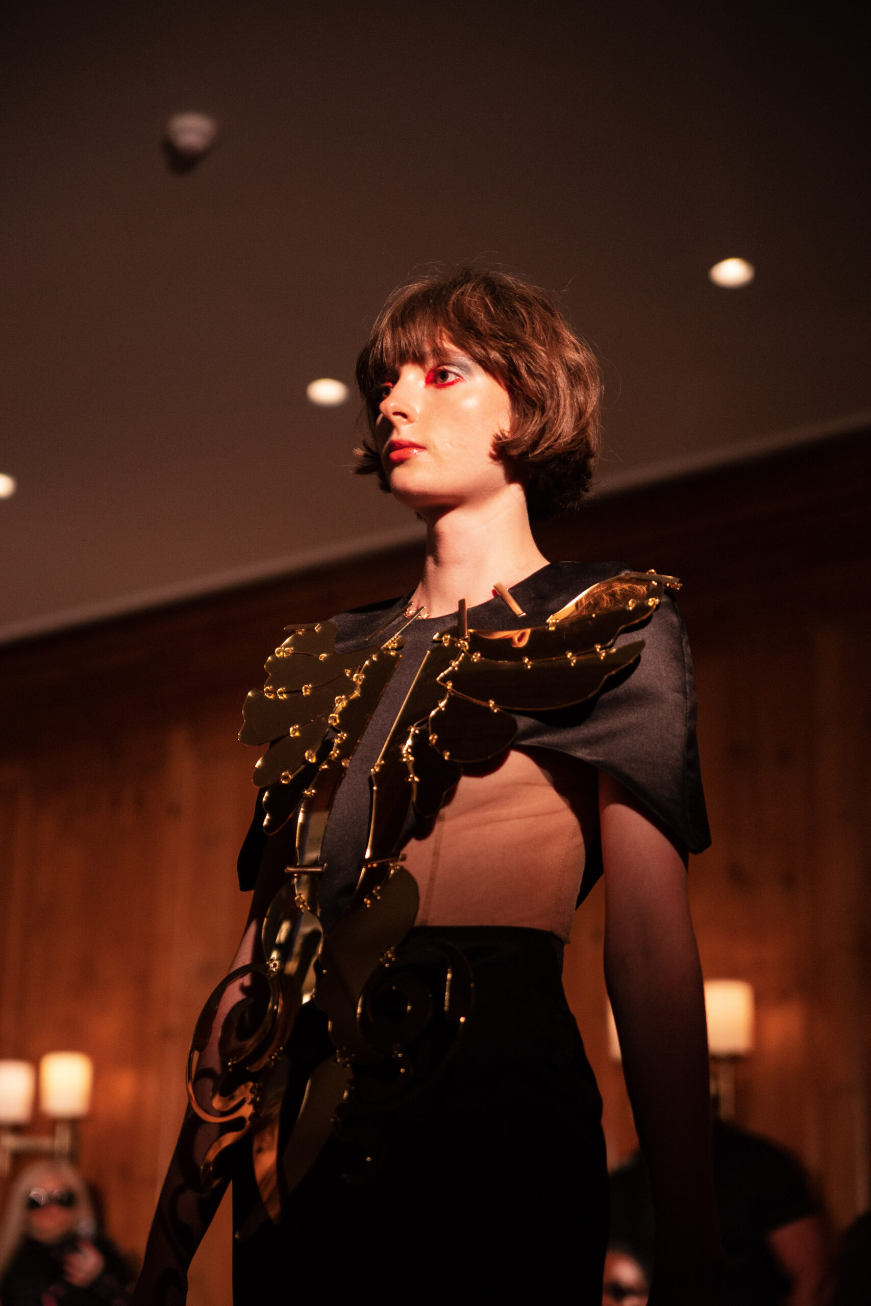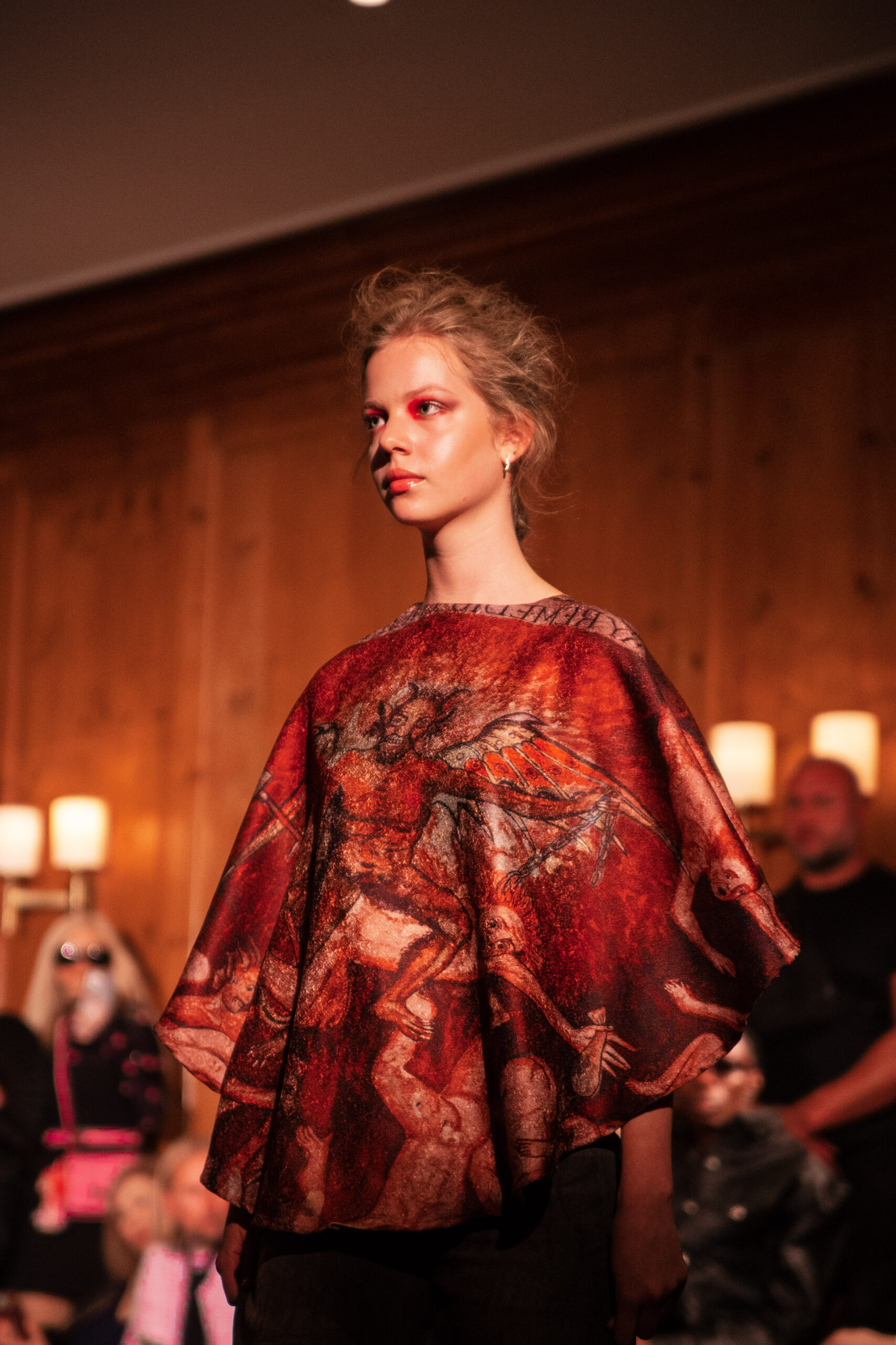 Red flowing robes embroidered with sacred figures, shawls etched with Latin scripture, and breastplates sculpted into gilded wings set the tone for the collection. Cut-out dresses appear frayed yet resolute, their fragile seams holding together in deliberate tension, a harmony born from rupture. Each garment becomes a relic of devotion and defiance – garments as modern altarpieces, balancing reverence with rebellion.