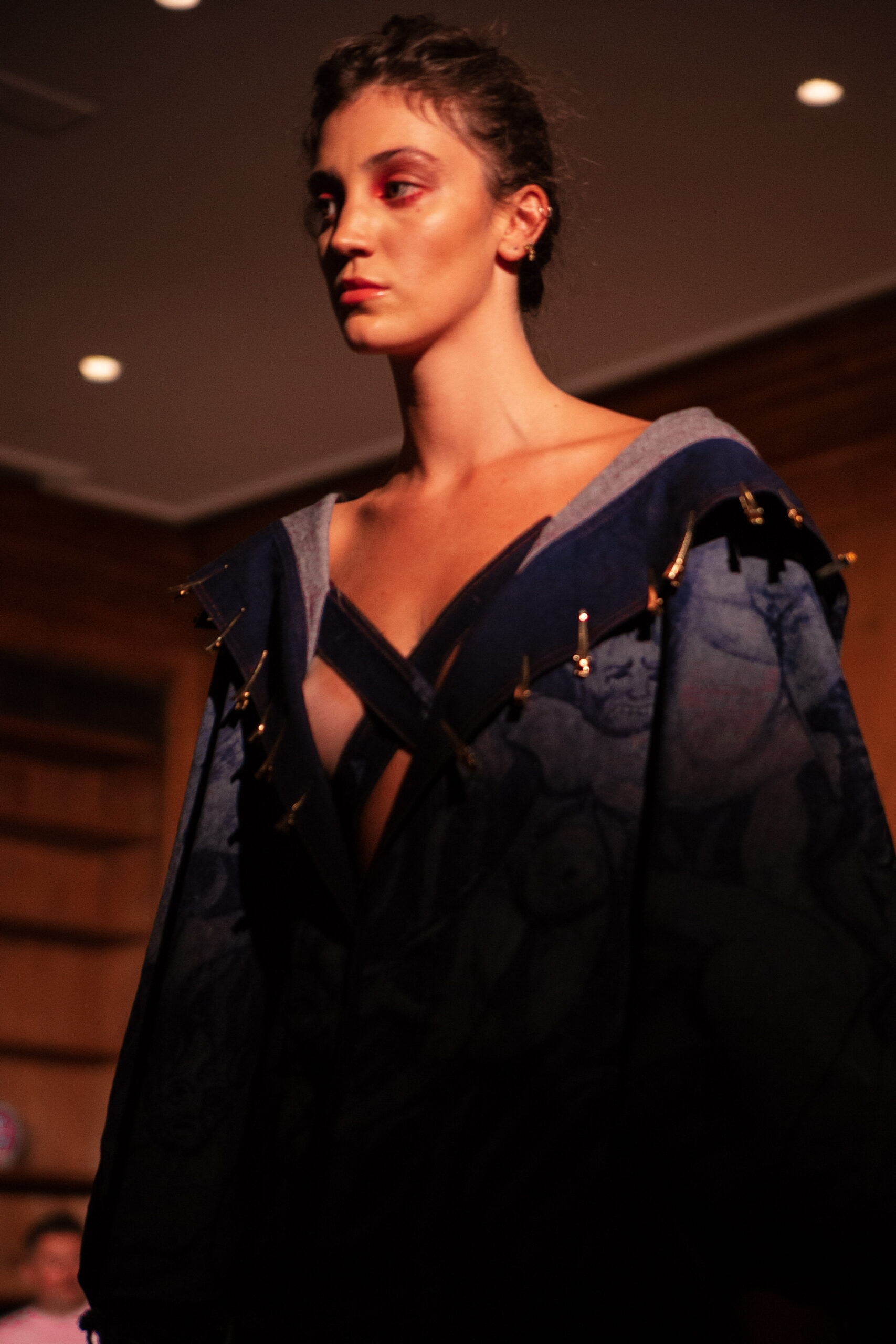Craftsmanship is at the heart of the collection. Upcycled denim, zero-waste cutting, and eco-conscious washing techniques sit alongside reworked silhouettes, like men’s trousers refashioned into dresses. Hand-applied zippers, resin details, 3D-printed accessories, and laser-cut acrylic accents elevate the designs, while 95 percent of production is executed by women collaborators, reinforcing Rivas’s commitment to purpose-driven fashion.