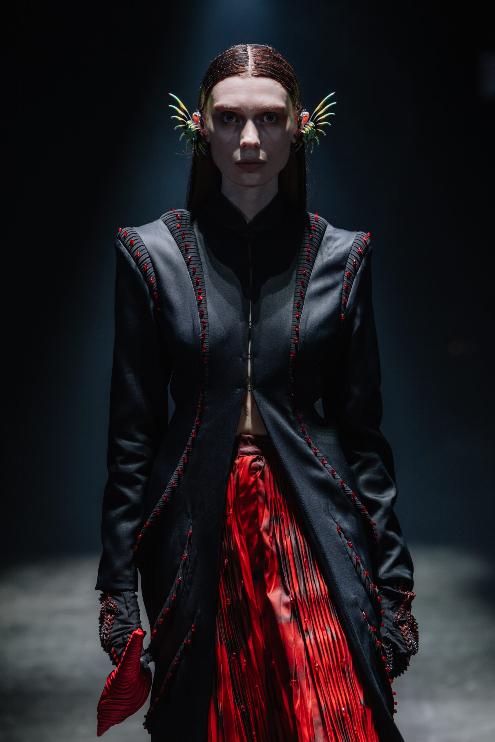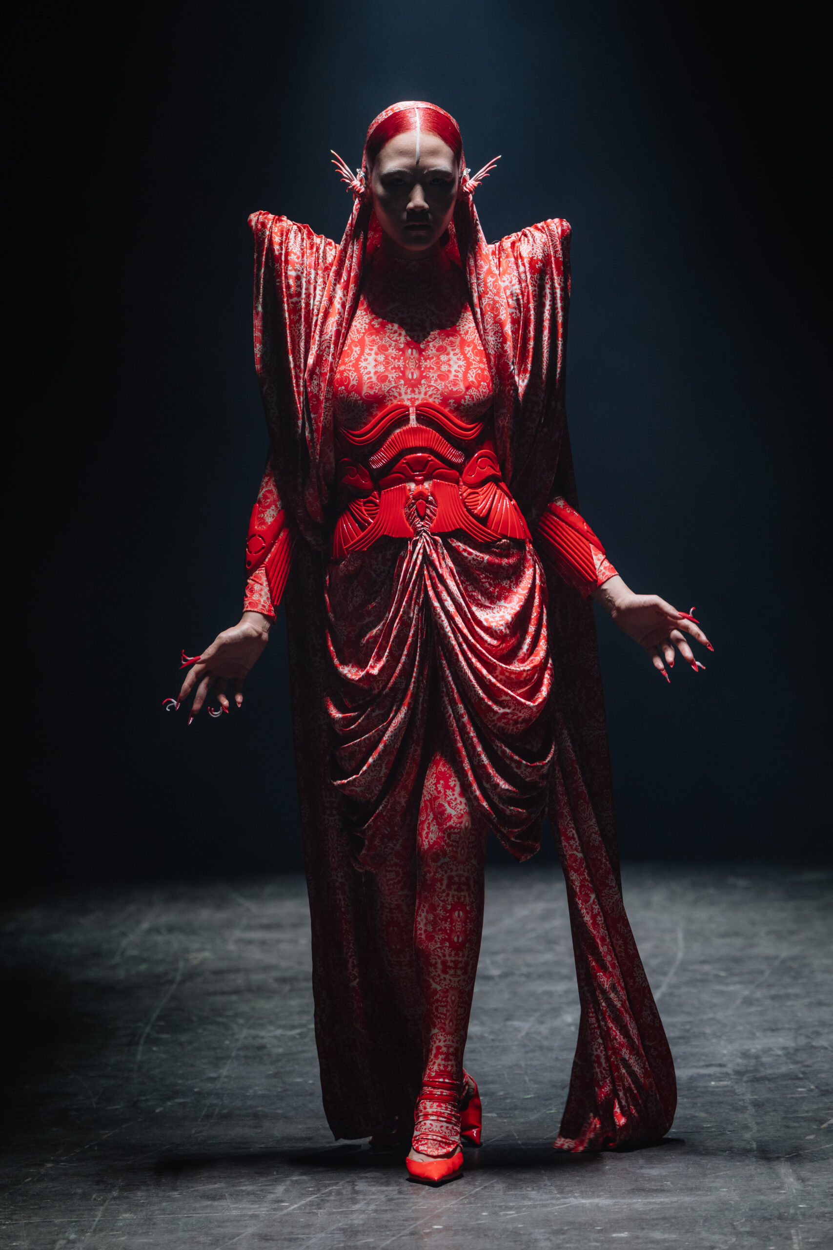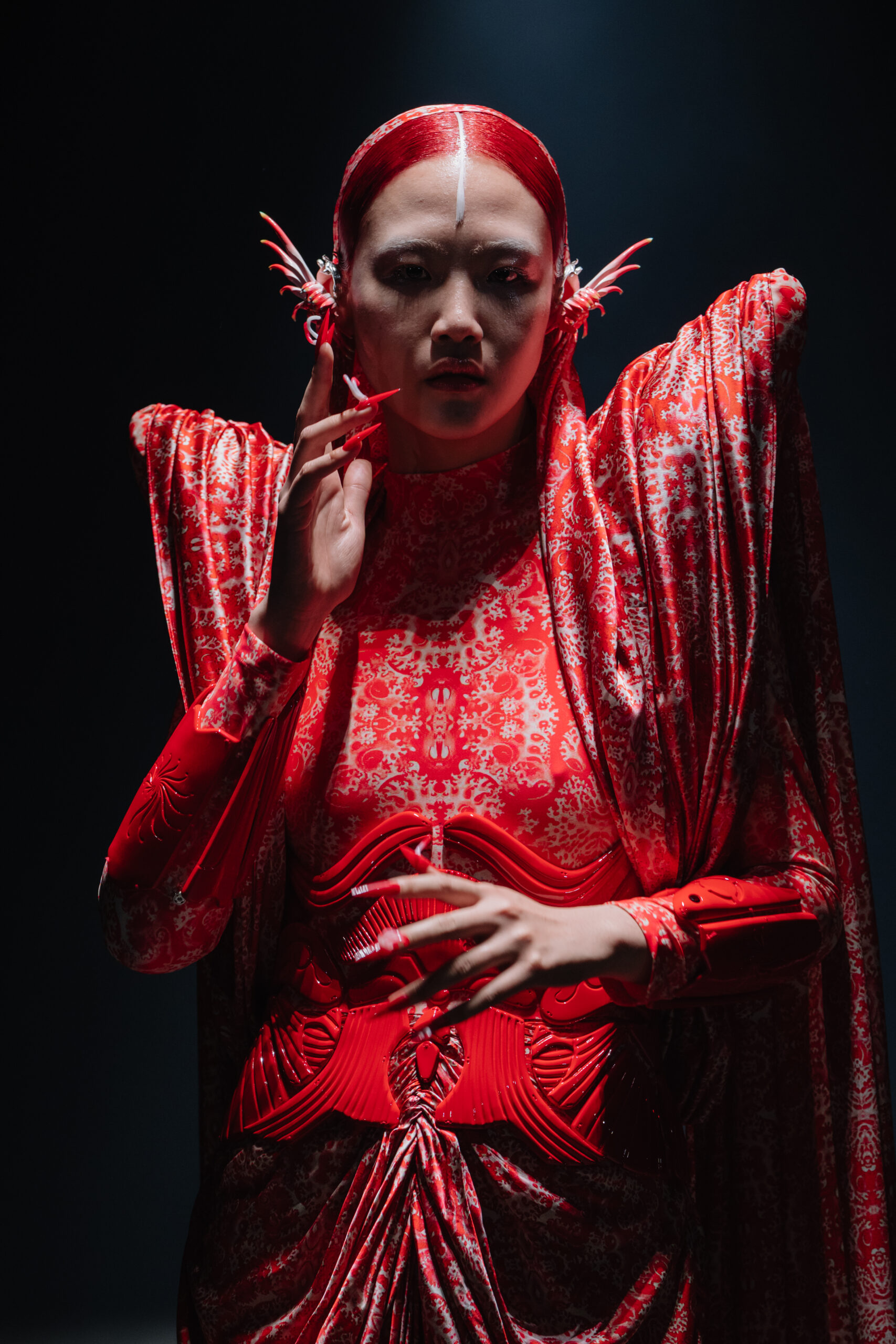 The collection reads as a dossier of imagined exoplanets: primordial beasts of Shan Hai Jing are reborn as hyper-organic, biomorphic archetypes, while Kunlun becomes a crashed generational starship, echoing lost voyages across interstellar space. The pieces themselves straddle fragility and resilience, with segmented armor, exoskeletal chitin, and iridescent scales realized in 3D-printed textiles and metallic filaments. It’s couture as codex, a fusion of sacred geometry, mechanical oracle scripts, and nebula imagery that makes garments pulse with both cultural memory and digital life.