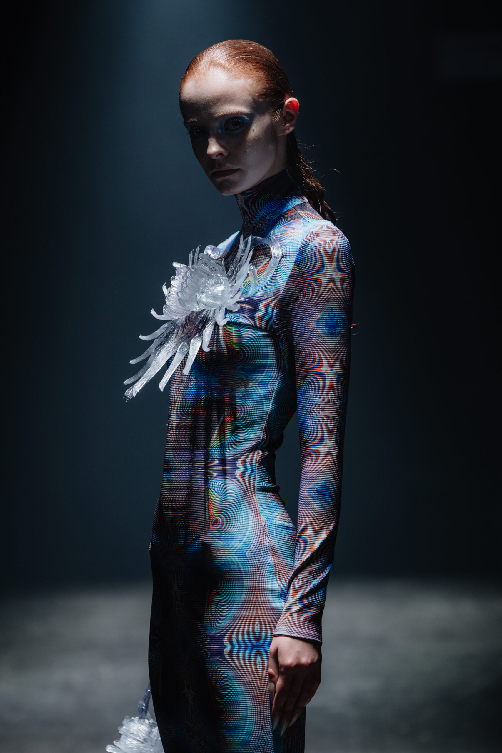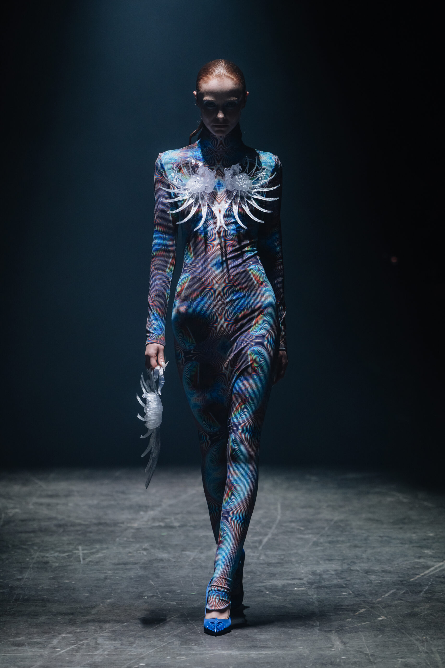 Traditional craftsmanship is present, but never sentimental. Jacquard and embroidery are reimagined as vessels of information, intertwining with algorithmic patterns to create a language that feels simultaneously ancient and extraterrestrial. The glowing bio-luminescent filaments that trace some of the silhouettes give the impression of clothing as living organisms—mutant yet elegant, alien yet deeply human.