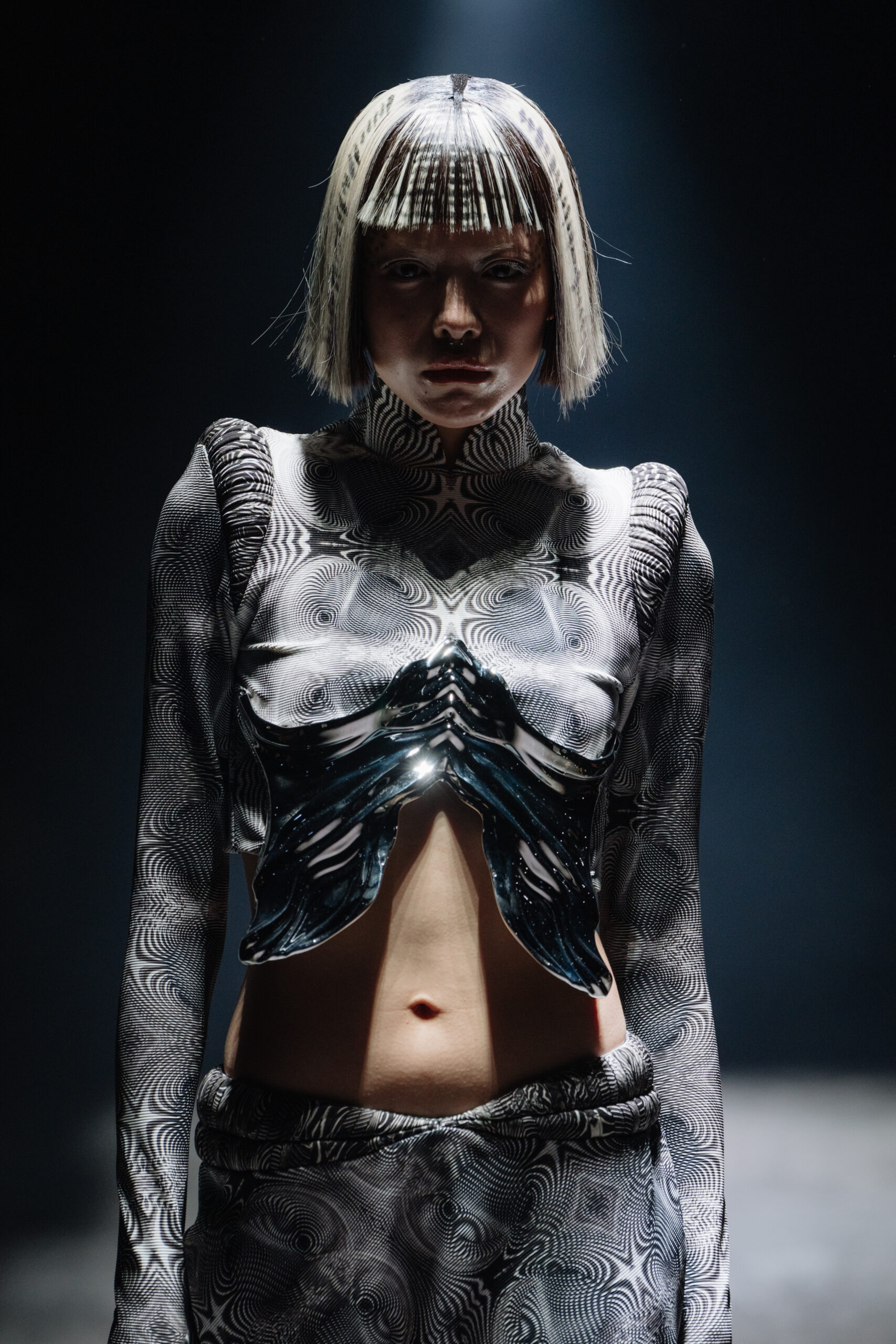 The runway itself became a stage for contemplation: models moved like sentinels of a forgotten cosmic history, their bodies framed by spiraling exoskeletons and laser-etched symbols that felt more like encrypted messages than fashion. There’s a radical fluidity here too—genderless, multidimensional, a language of form that refuses the human body’s conventional limitations.