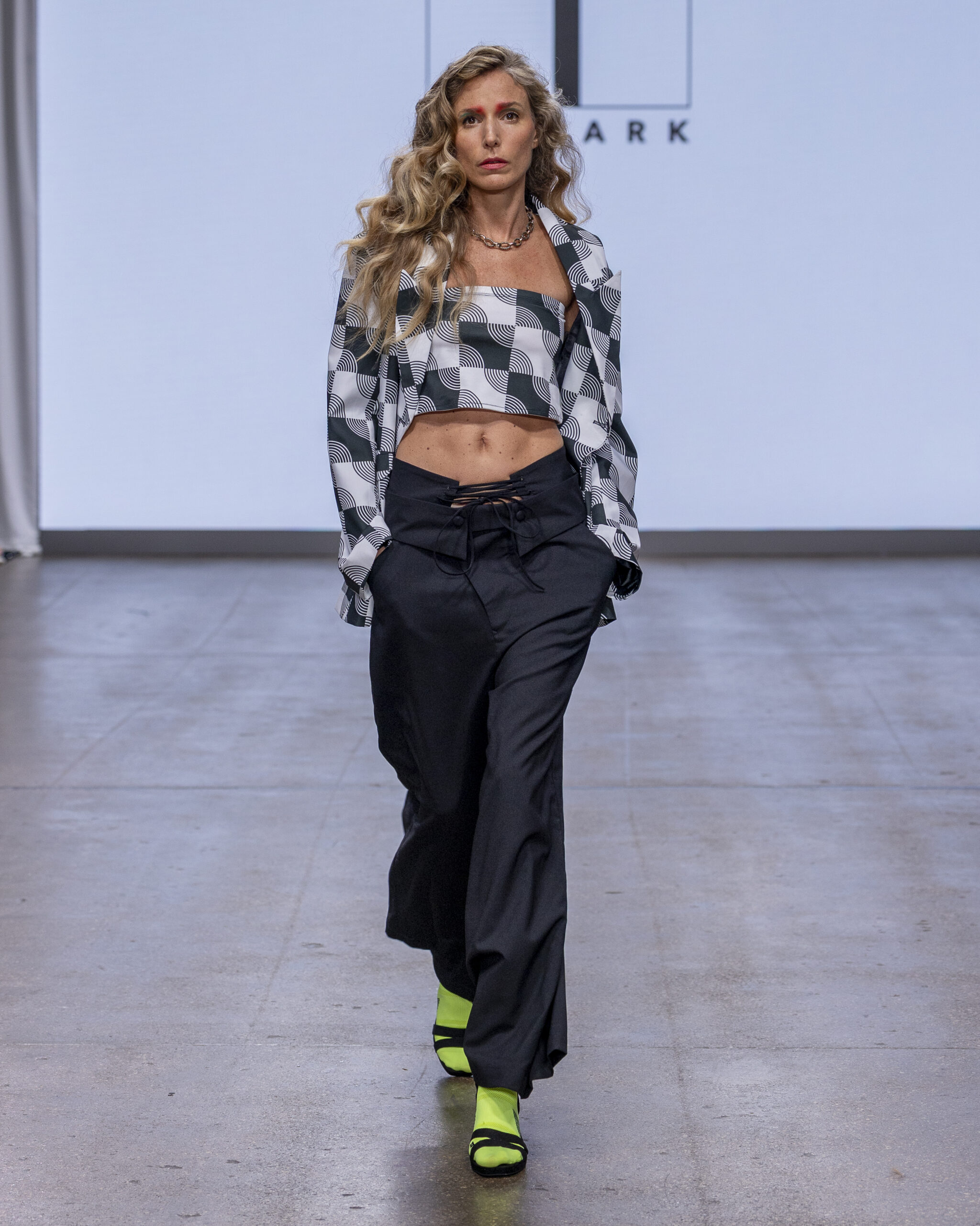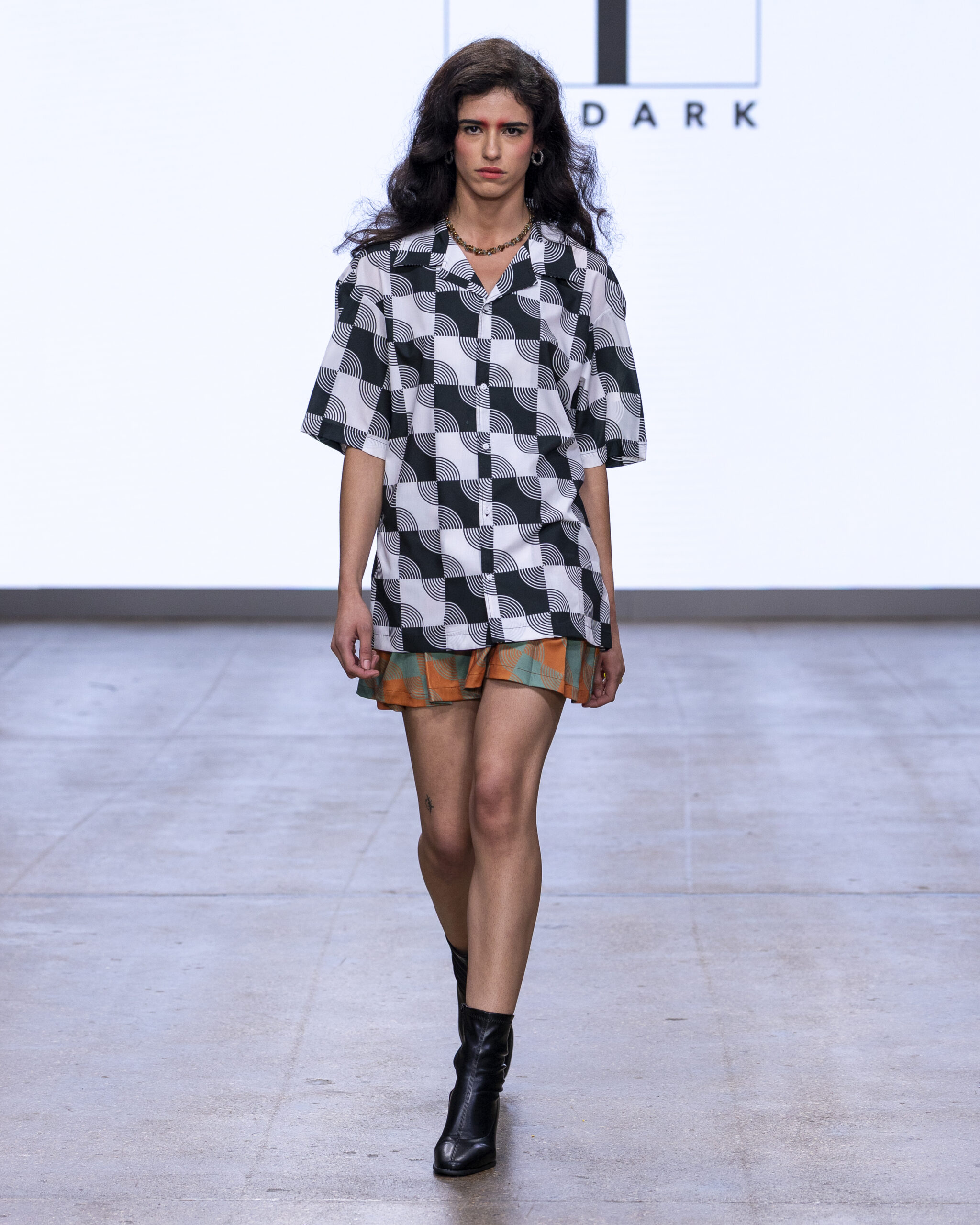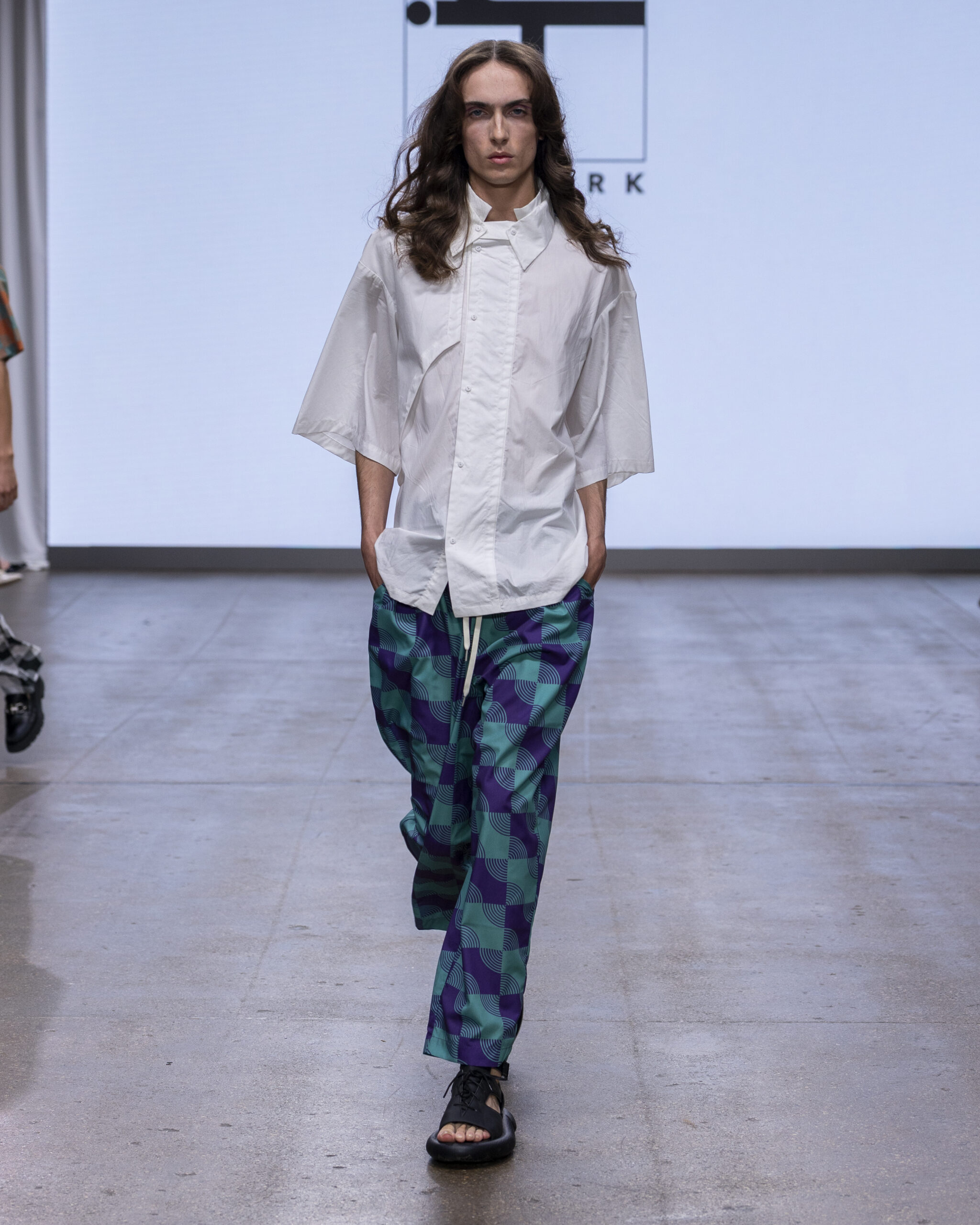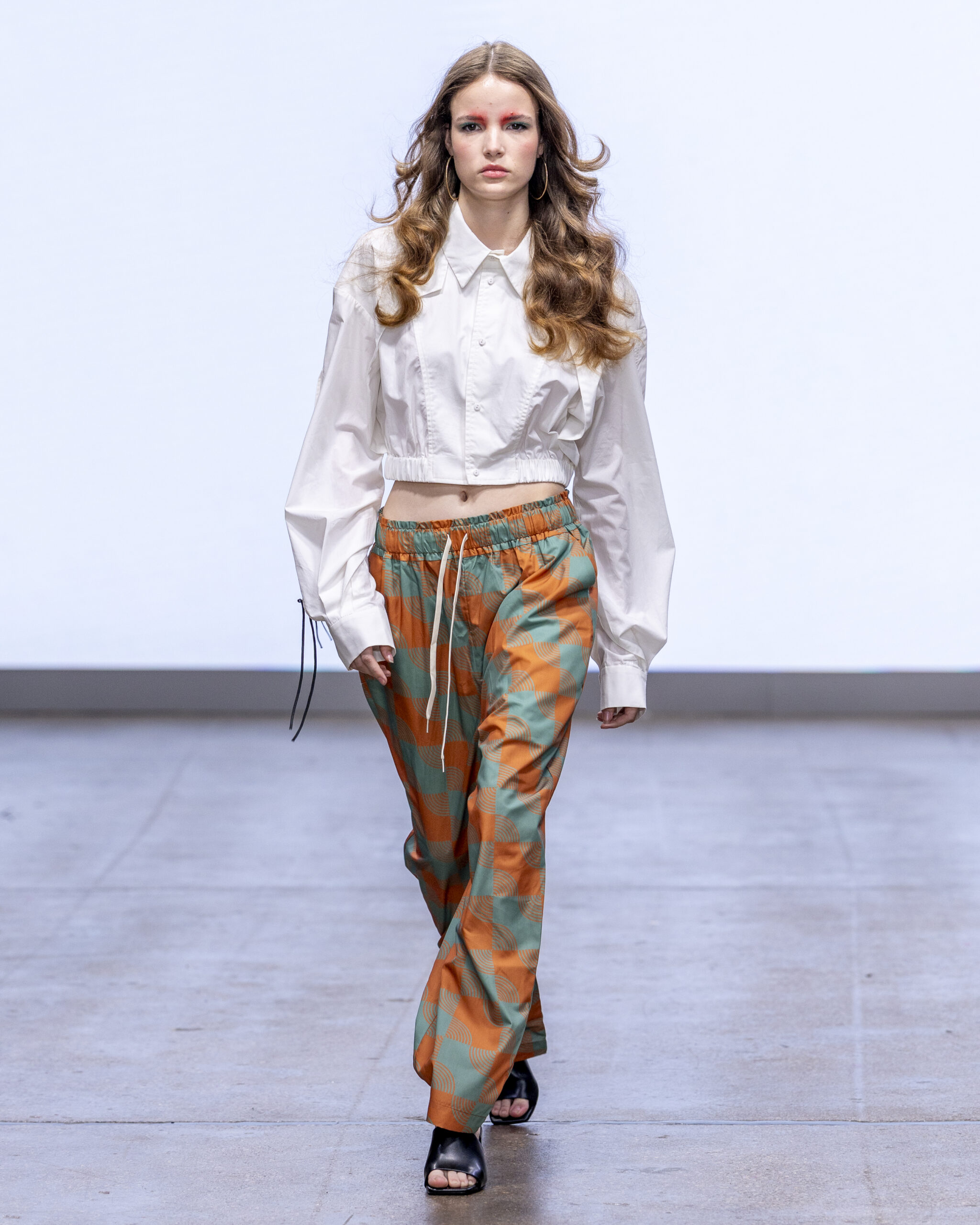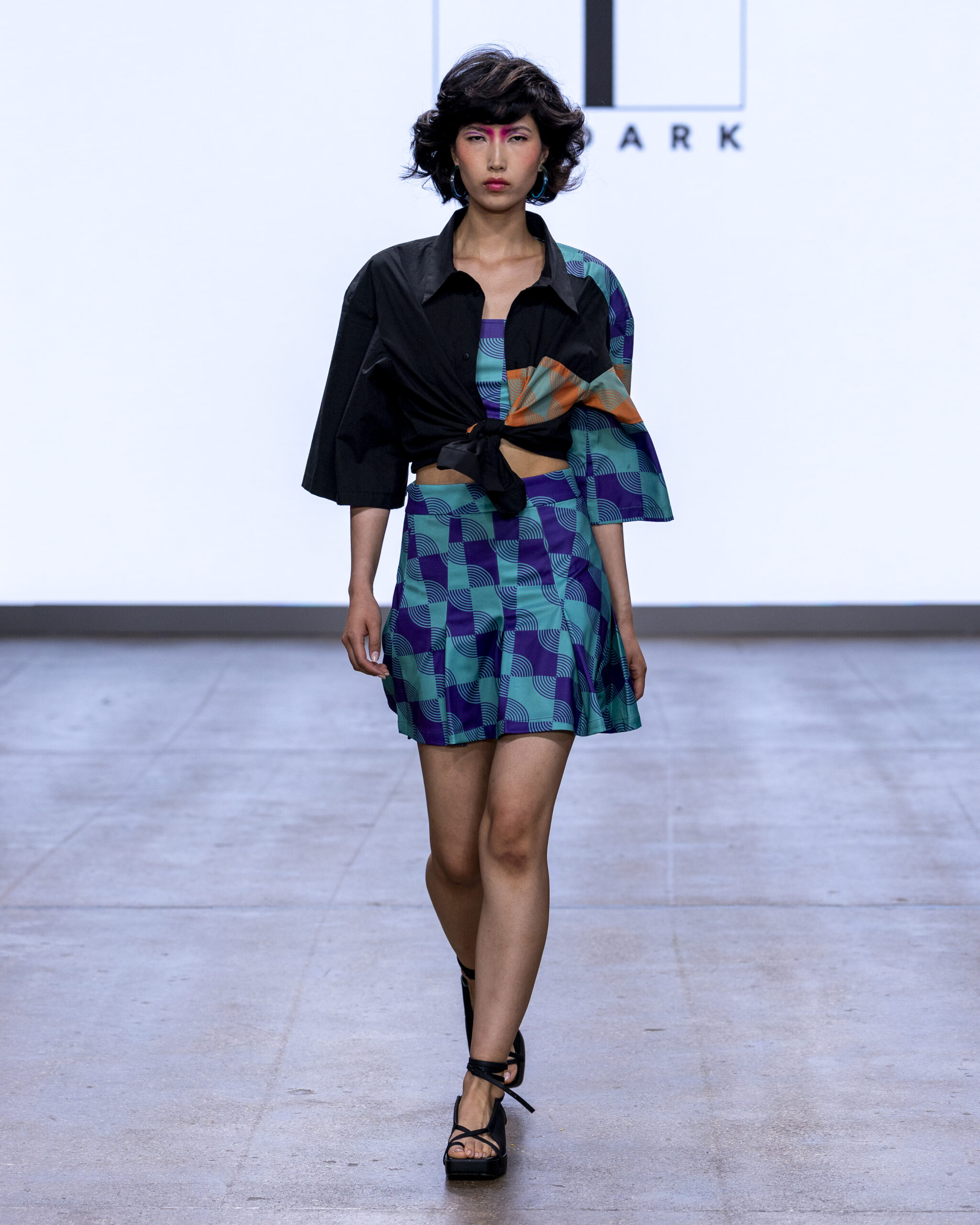 Visually, the collection drew heavily on the Memphis design movement, its bold geometric motifs and optical illusions woven into three original prints. These patterns vibrated with nostalgic references to interiors, architecture, and arcade games of the designer’s youth, but were reimagined for a future-facing world.