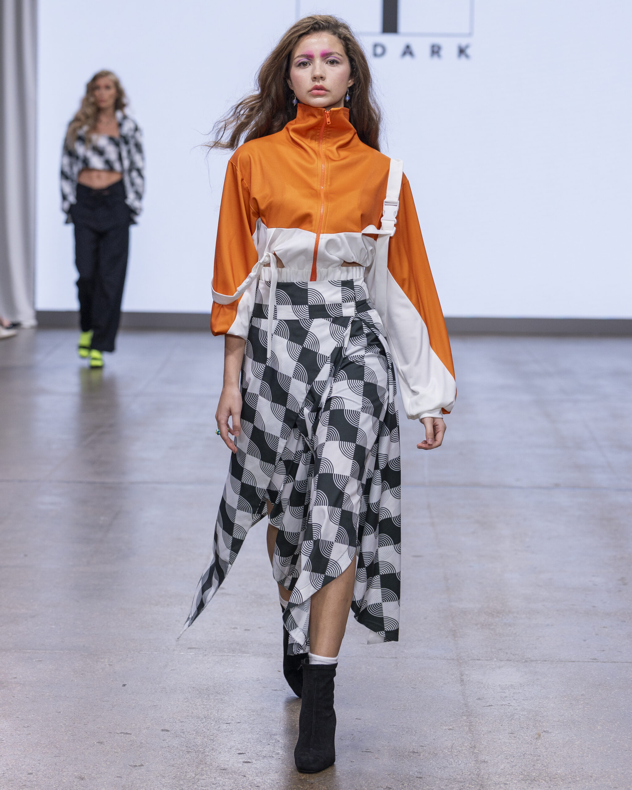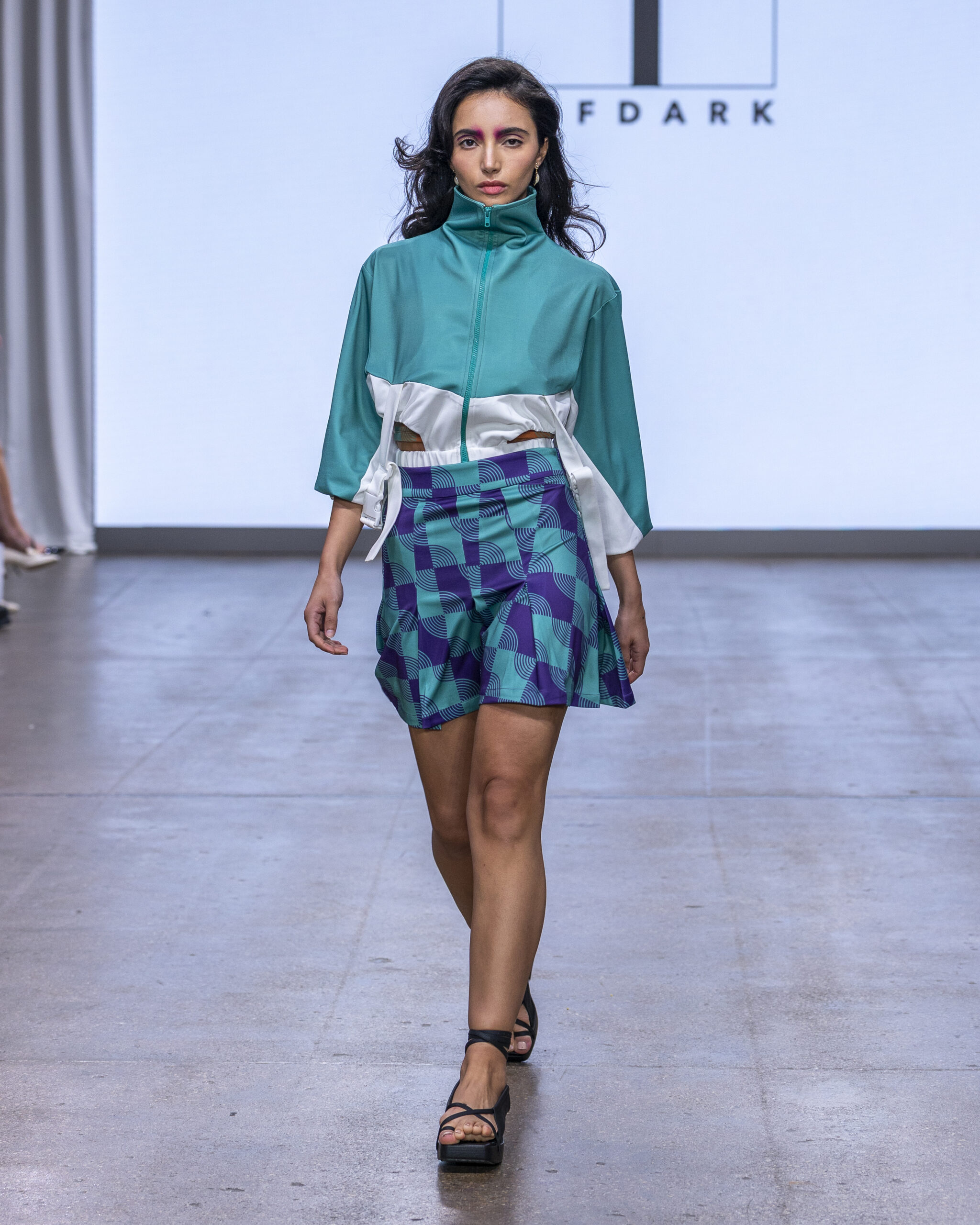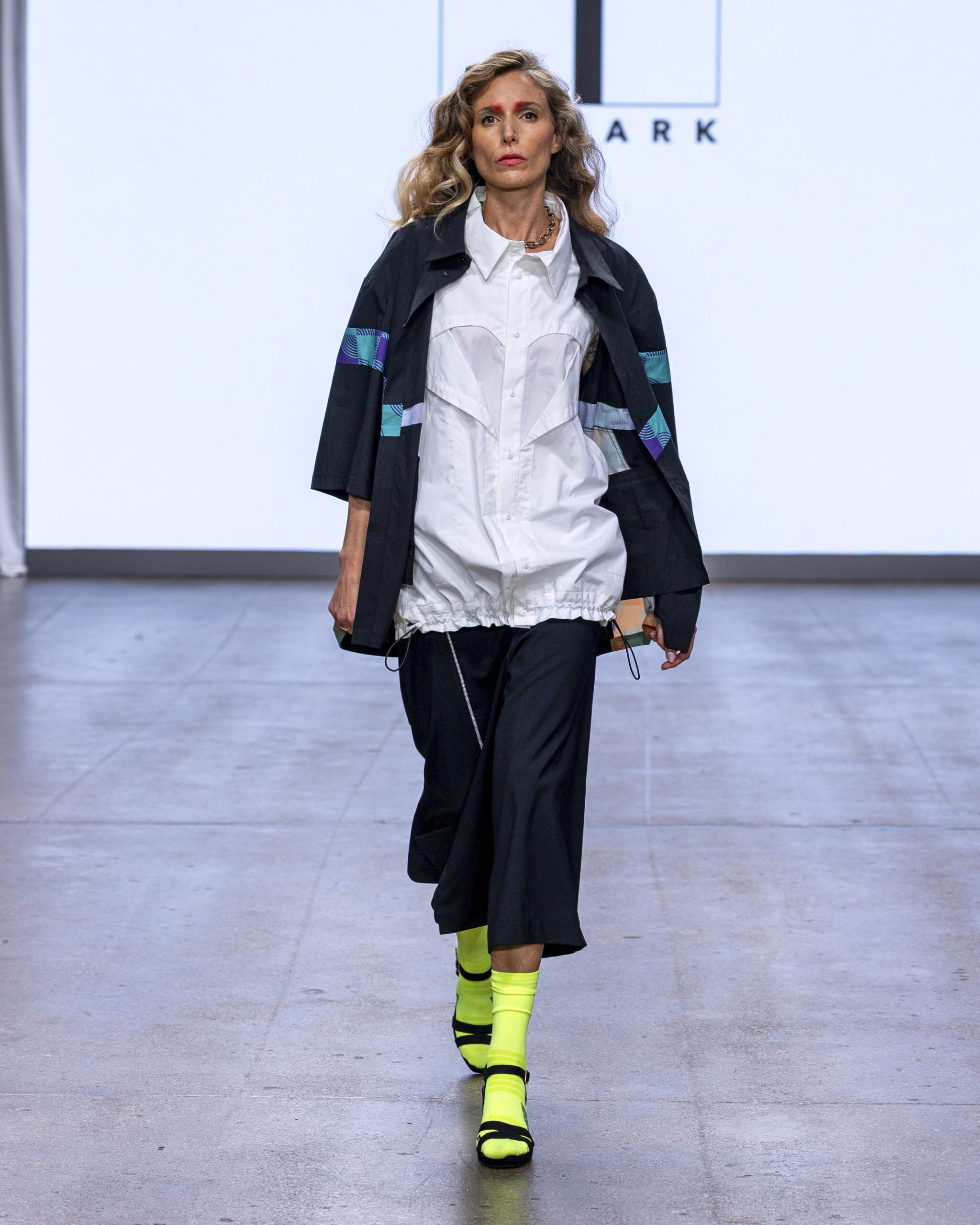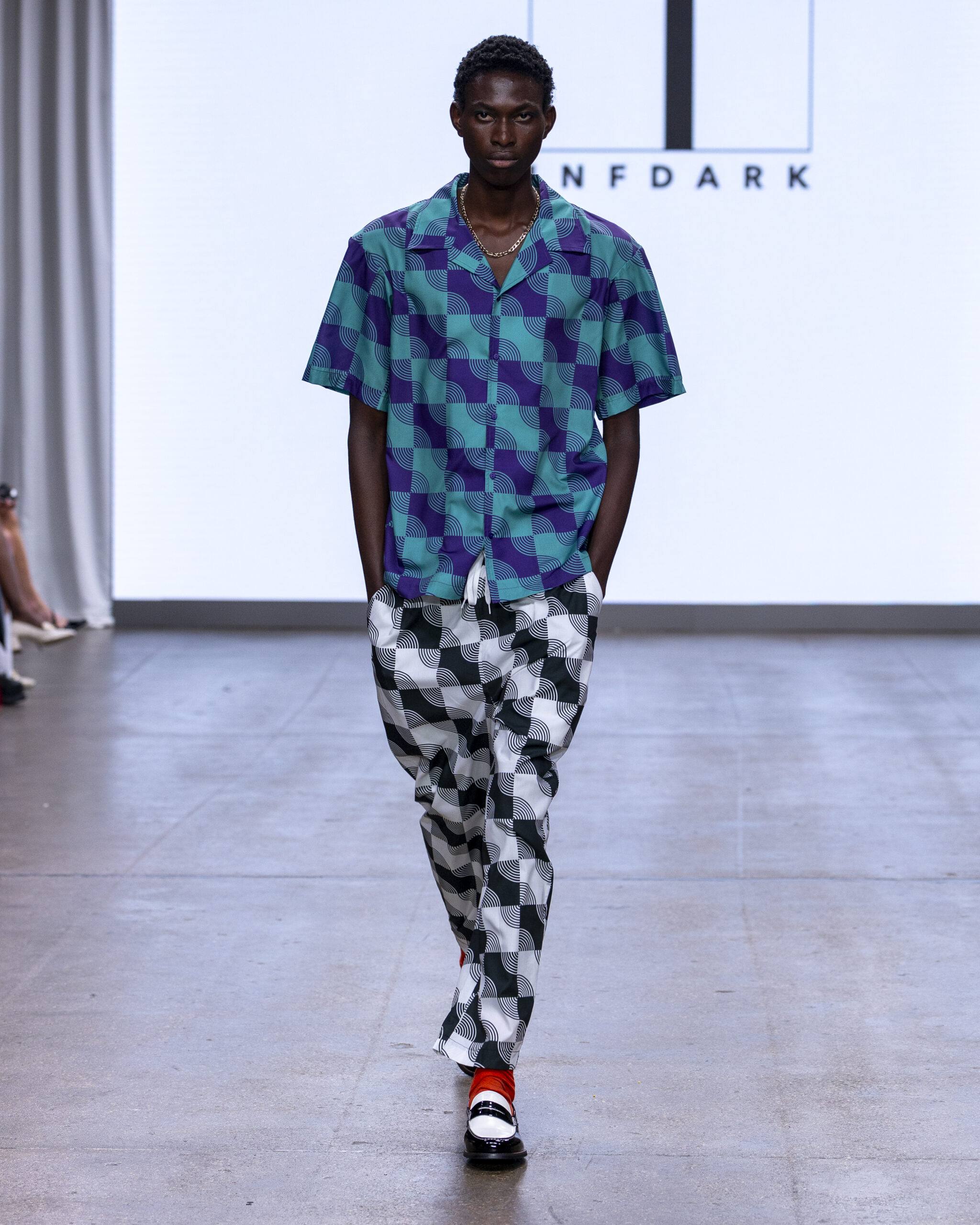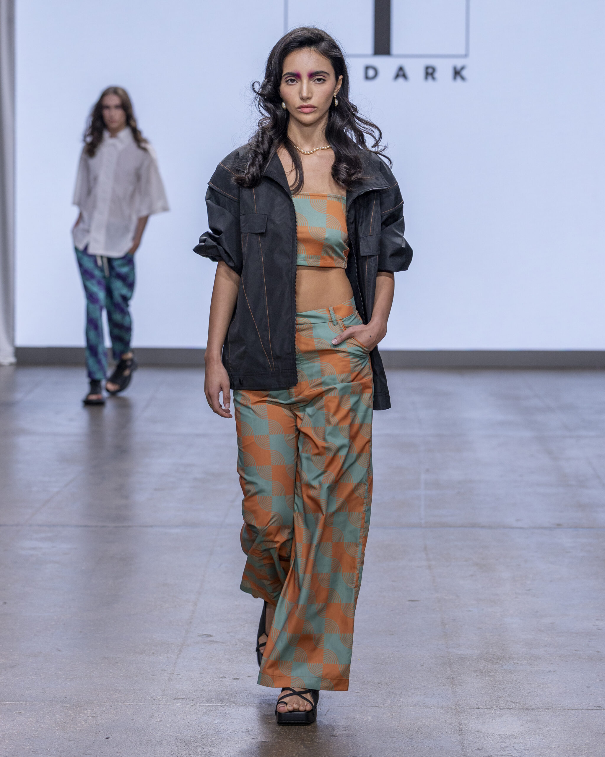 Visually, the collection drew heavily on the Memphis design movement, its bold geometric motifs and optical illusions woven into three original prints. These patterns vibrated with nostalgic references to interiors, architecture, and arcade games of the designer’s youth, but were reimagined for a future-facing world.