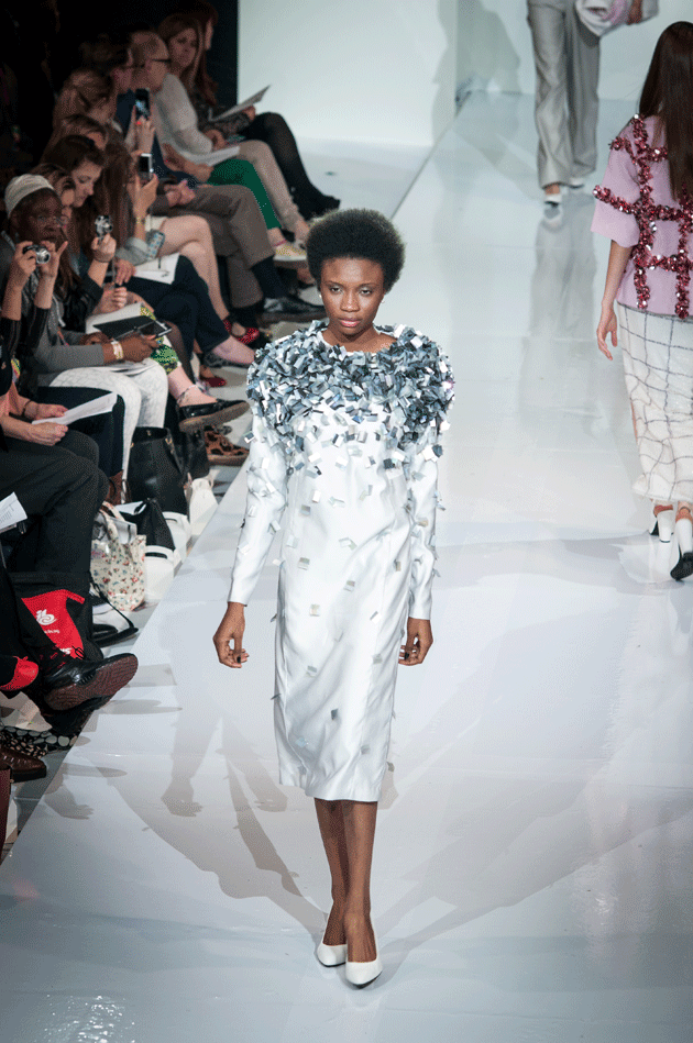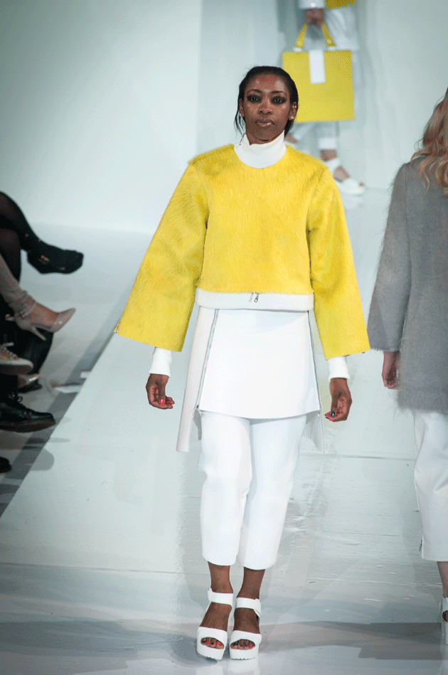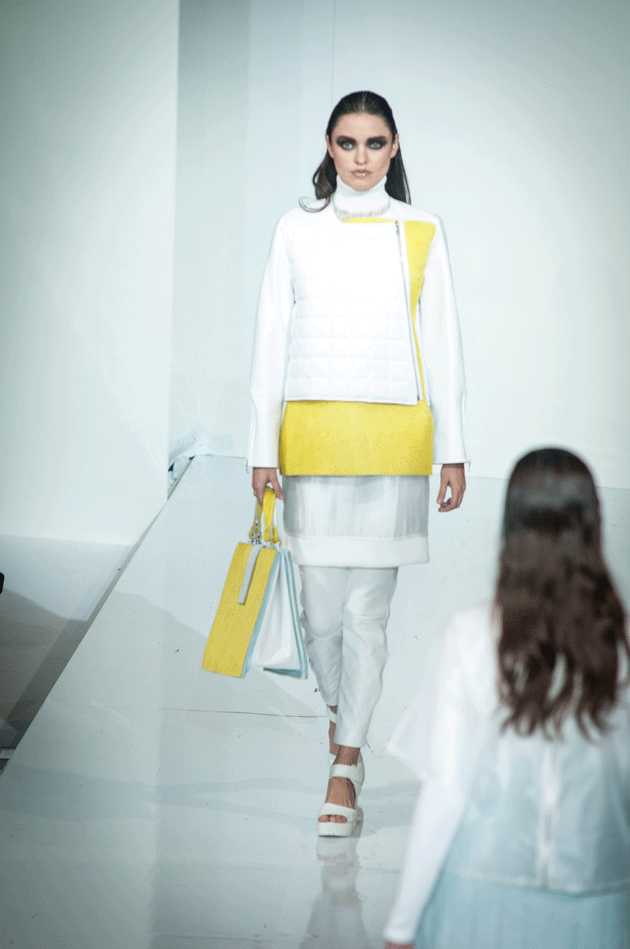 It was a futuristic story with Patricia William’s collection. A clean palette of yellow, white and grey allowed for the details to steal the show. Sharp architectural silhouettes exuded power and the segmentation of padded leather alongside zips and graphic lines created new shapes that were both intriguing and alluring.