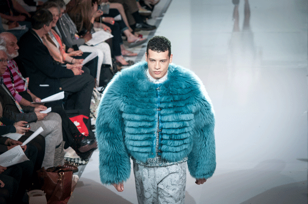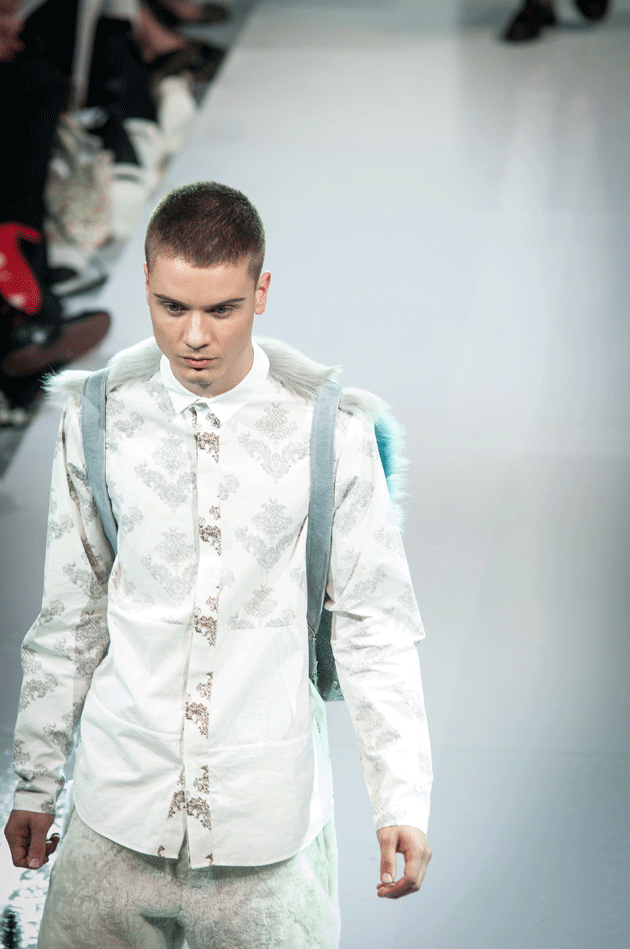 When the first look of your collection is a teal-fur, American football style silhouette you immediately sit up and take notice. Jack’s menswear used fur predominantly throughout, whether that was as an accent on a printed shirt or a huge coat with monstrous fur arms. I am usually the naysayer when it comes to men in fur. Jack Bebbington has converted me. Just call me a Furry. Well not that kind of Furry.