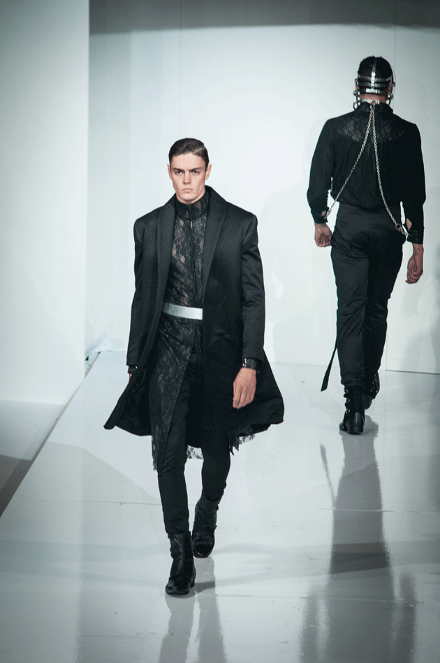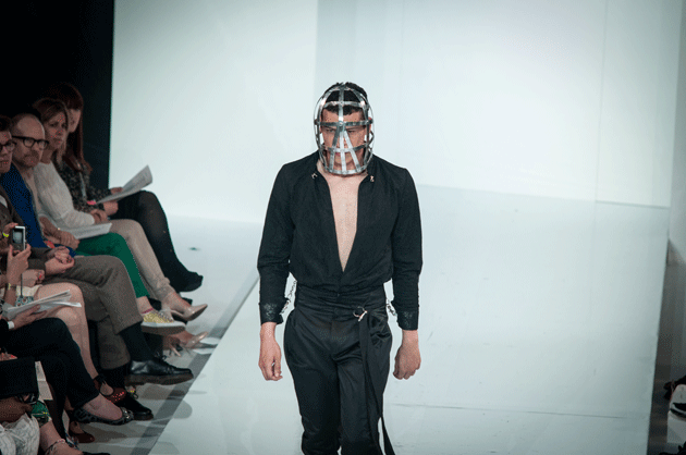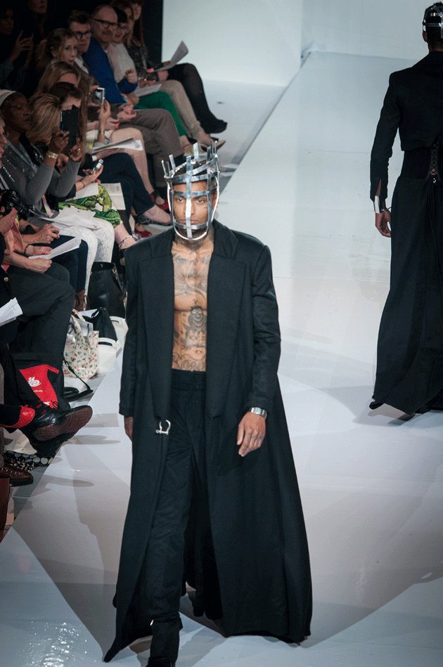 One of the darkest collections of the show but brought a new perspective on sinister influences. Harris has interned with Keko Hainswheeler creating outfits for Lady Gaga already so he has already gained notable attention. Models stormed out in black ensembles, some accompanied by caged headwear, chains and devices of chastity. The first thing that sprang to mind was a reminder of the late, great McQueen, not only due to its dark and slightly evil mood but the technical details, as well as the idea of ceremony and androgyny.